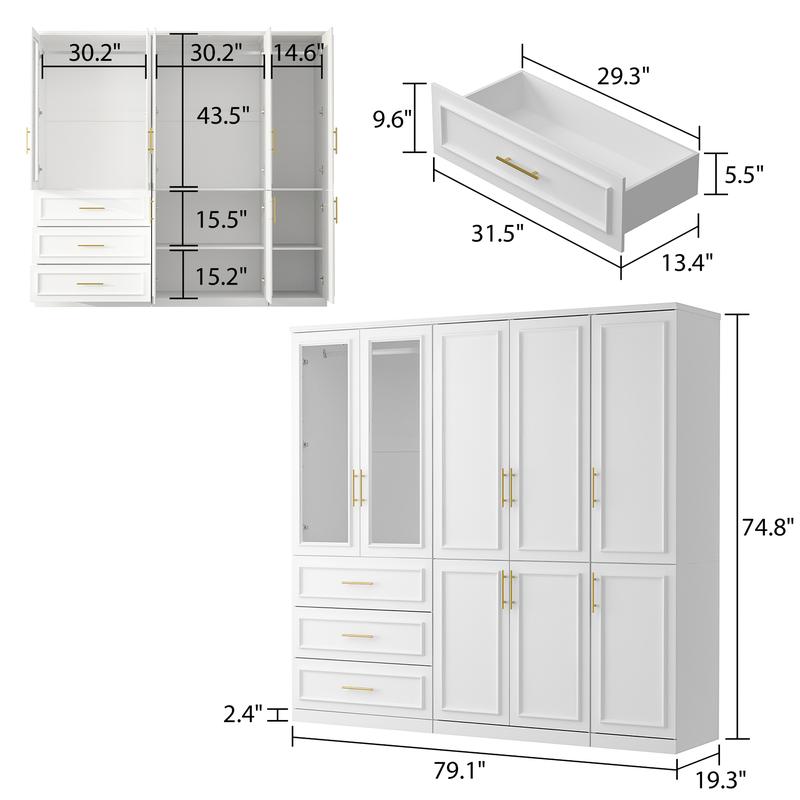 Each wardrobe has a large capacity designed to meet various storage needs. Easily store clothes, shoes, and other items to keep your home neat and organized. In addition to the folding and hanging areas, our combination wardrobe includes multiple drawers and glass door cabinets for additional storage. You can easily find what you need and keep everything tidy.