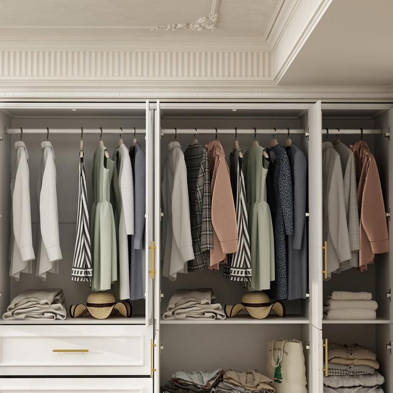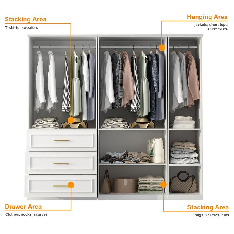 This combination wardrobe includes 3 wardrobe combinations, providing ample storage space for organizing clothes and shoes. Each wardrobe features both stacking and hanging areas to meet different storage needs, along with multiple drawers and glass door cabinets for storing small items and accessories. The glass doors offer greater visibility of your belongings.