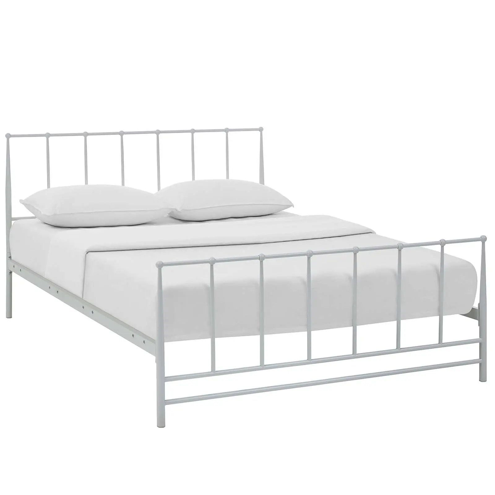 Introduce a serene and relaxed look with the exceptionally built Estate Platform Bed. Gracefully designed with integrated round finials, comprehensive headboard to footboard construction, charming tapered frame made of coated steel, non-marking foot caps, and a reinforced center beam with supporting legs for maximal stability, Estate is a nostalgic piece built upon the standards of design excellence. Reminiscent of nostalgic cottages and country homes, Estate’s rail system eliminates the need for a box spring, and admirably supports mattress types such as memory foam, spring, latex, and hybrid. Weight capacity up to 1300 lbs. Mattress Not Included.