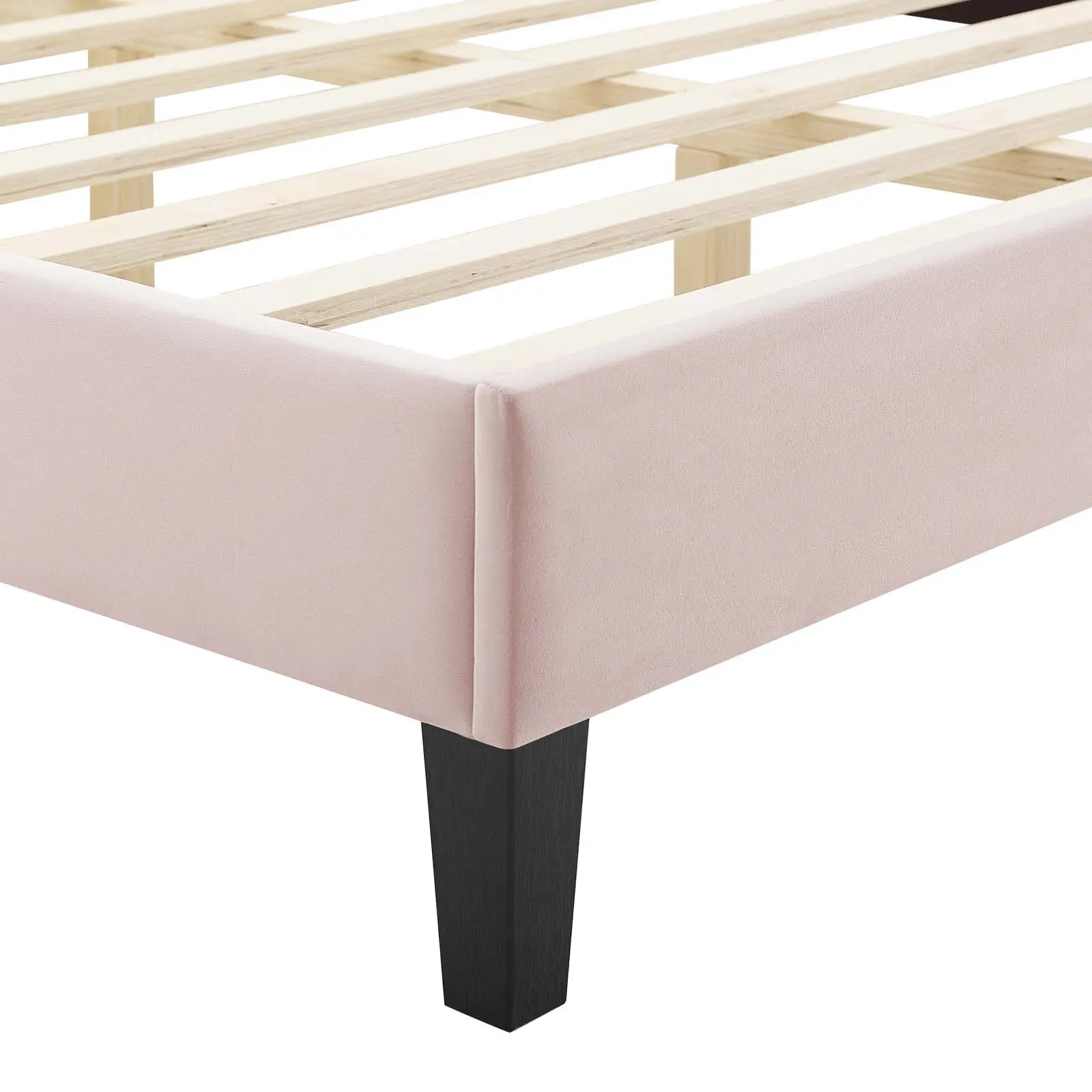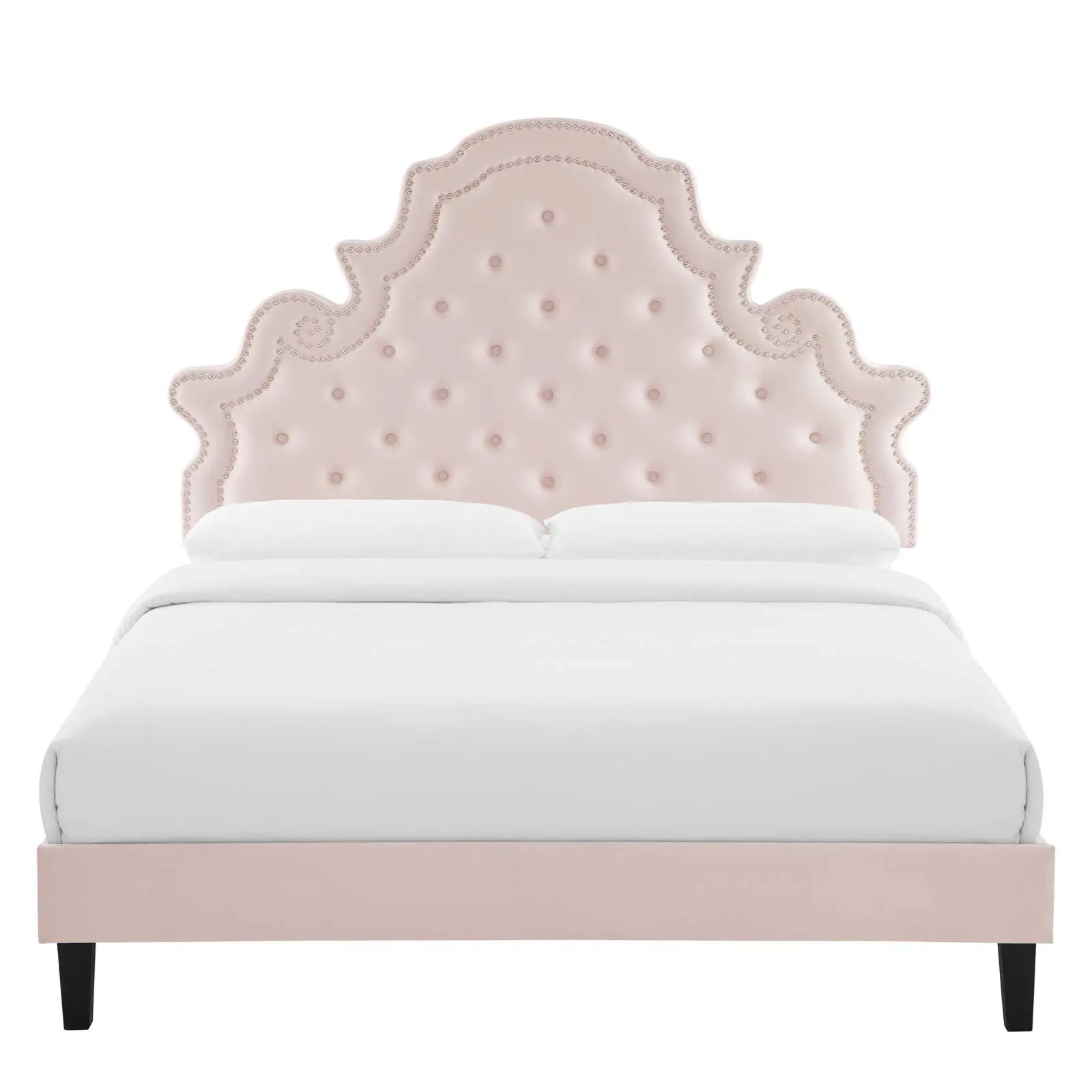 Elaborate details exude regal luxury and vintage glamour in a master bedroom or guest bedroom on the Gwyneth Tufted Performance Velvet Queen Platform Bed. Featuring classic button tufting and nailhead trim framing the avant garde silhouette, the queen headboard of this platform bed is a stunning addition to a master bedroom or guest bedroom. Upholstered in soft, stain-resistant performance velvet, the padded headboard offers supportive comfort while sitting up in bed reading, relaxing, or watching TV. This upholstered bed is a sturdy mattress foundation for memory foam, innerspring, latex, and hybrid mattresses. Eliminating the need for a box spring, the MDF frame of this queen bed is complete with a wood slat support system crafted with poplar for lasting durability and support. This slatted bed frame rests on black wood legs with non-marking foot caps and includes a reinforced center beam with two support legs for enhanced stability. Assembly required. Weight Capacity: 800 lbs.