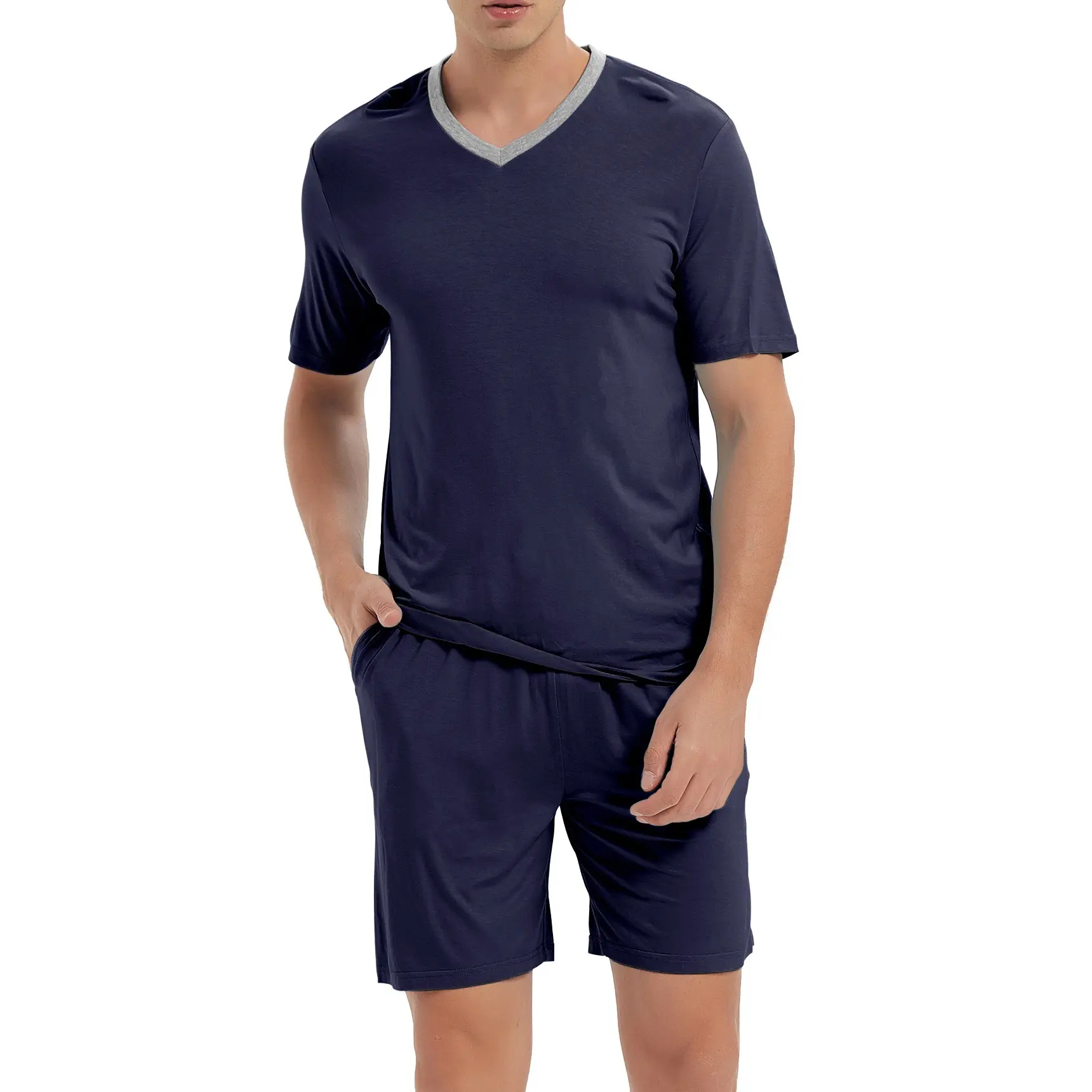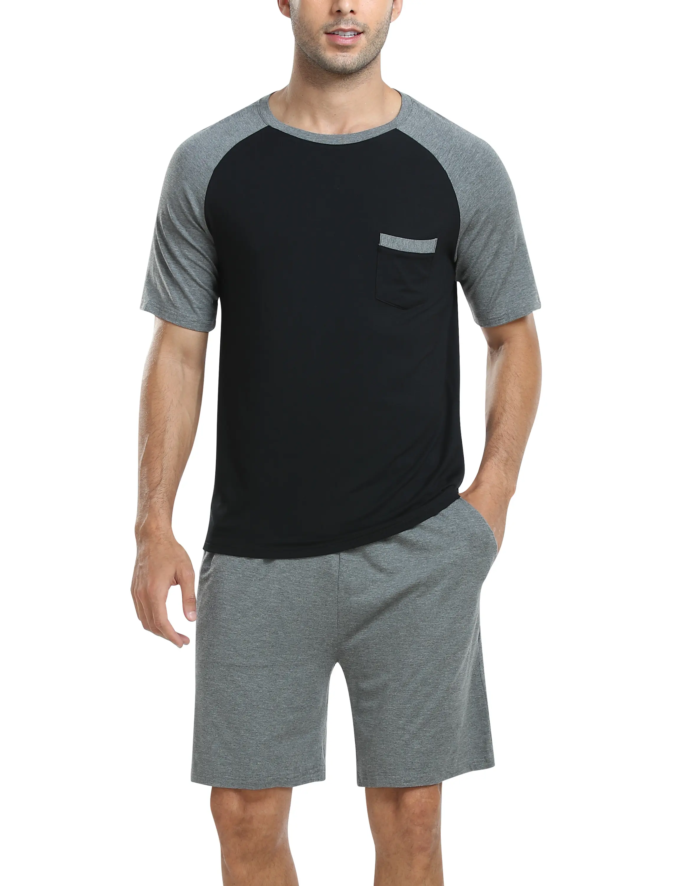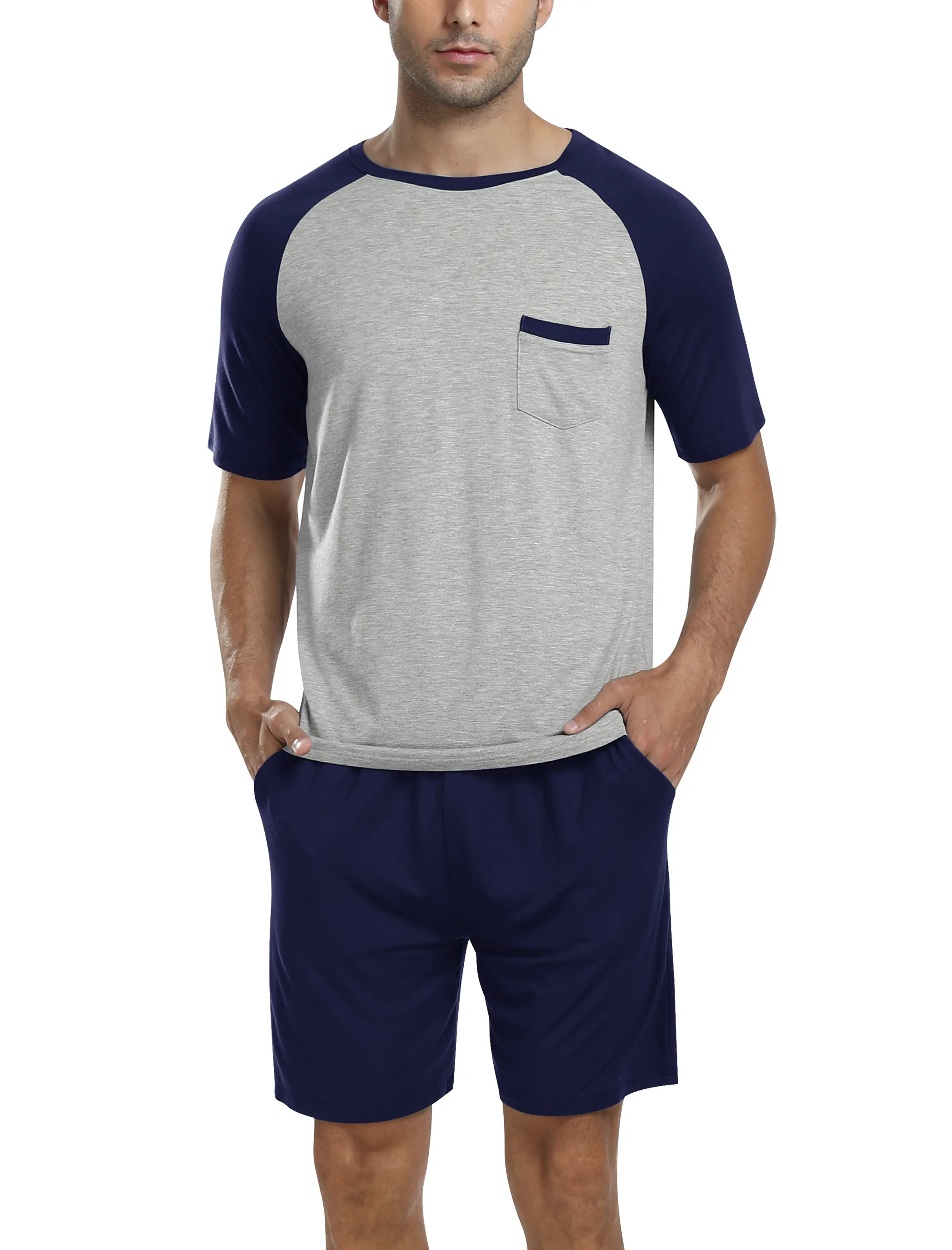 ·Men's short sleeve pjs 2 piece for you design contrast color V neck short sleeves with 2 side pockets of 5"shorts, appear more casual fashion.