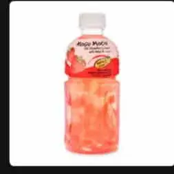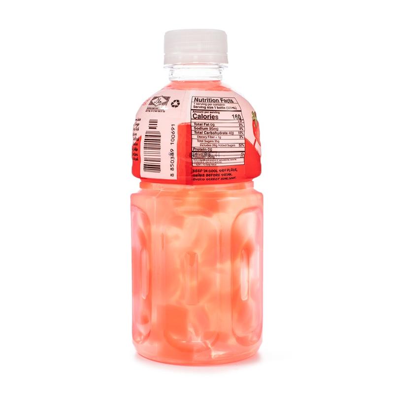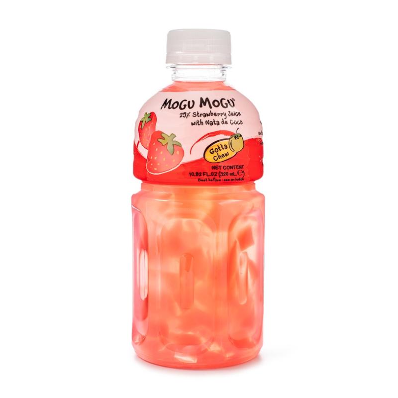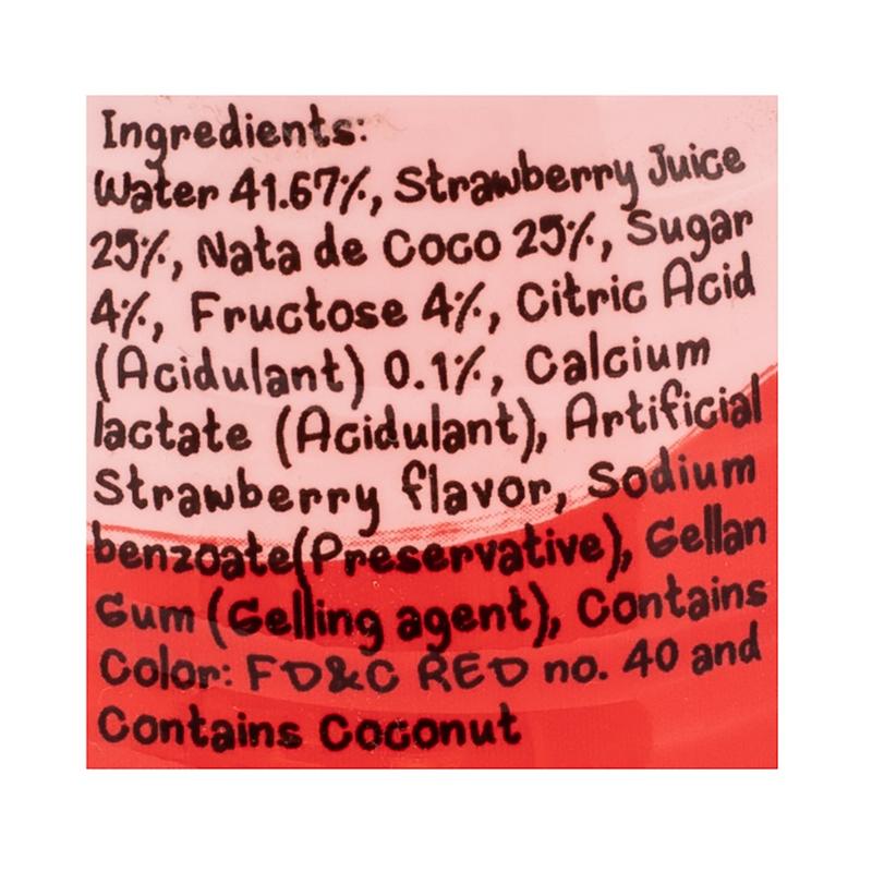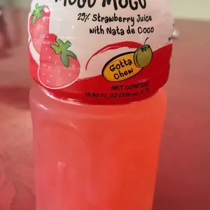 Very subtle sweet strawberry taste not too artificial. The coconut chunks are large and plenty. This is a chewing drink.