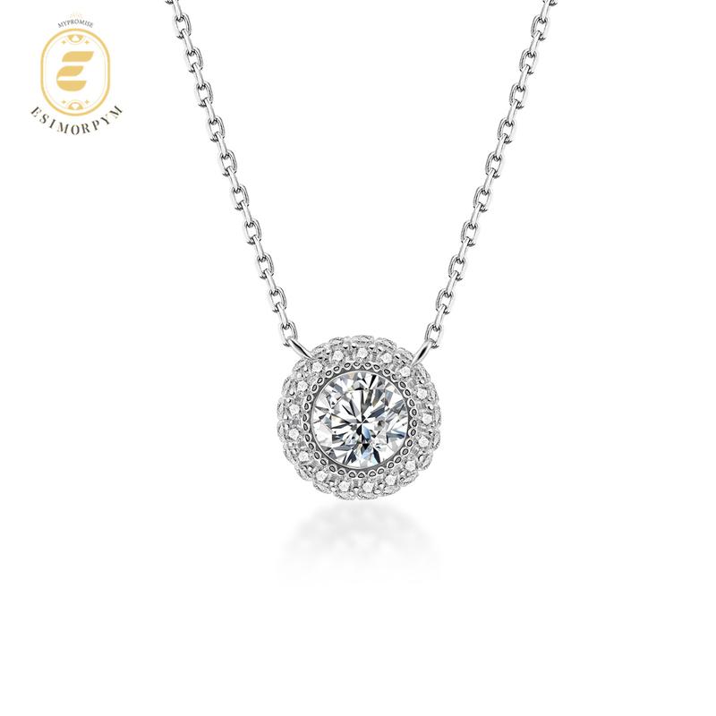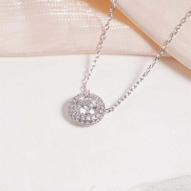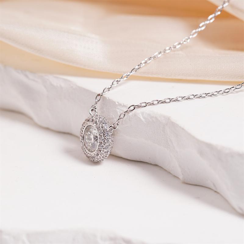 ·At the heart of this necklace lies a round moissanite, surrounded by a delicate halo of shimmering accent stones. The halo frame enhances the brilliance of the center stone, catching the light with every movement.