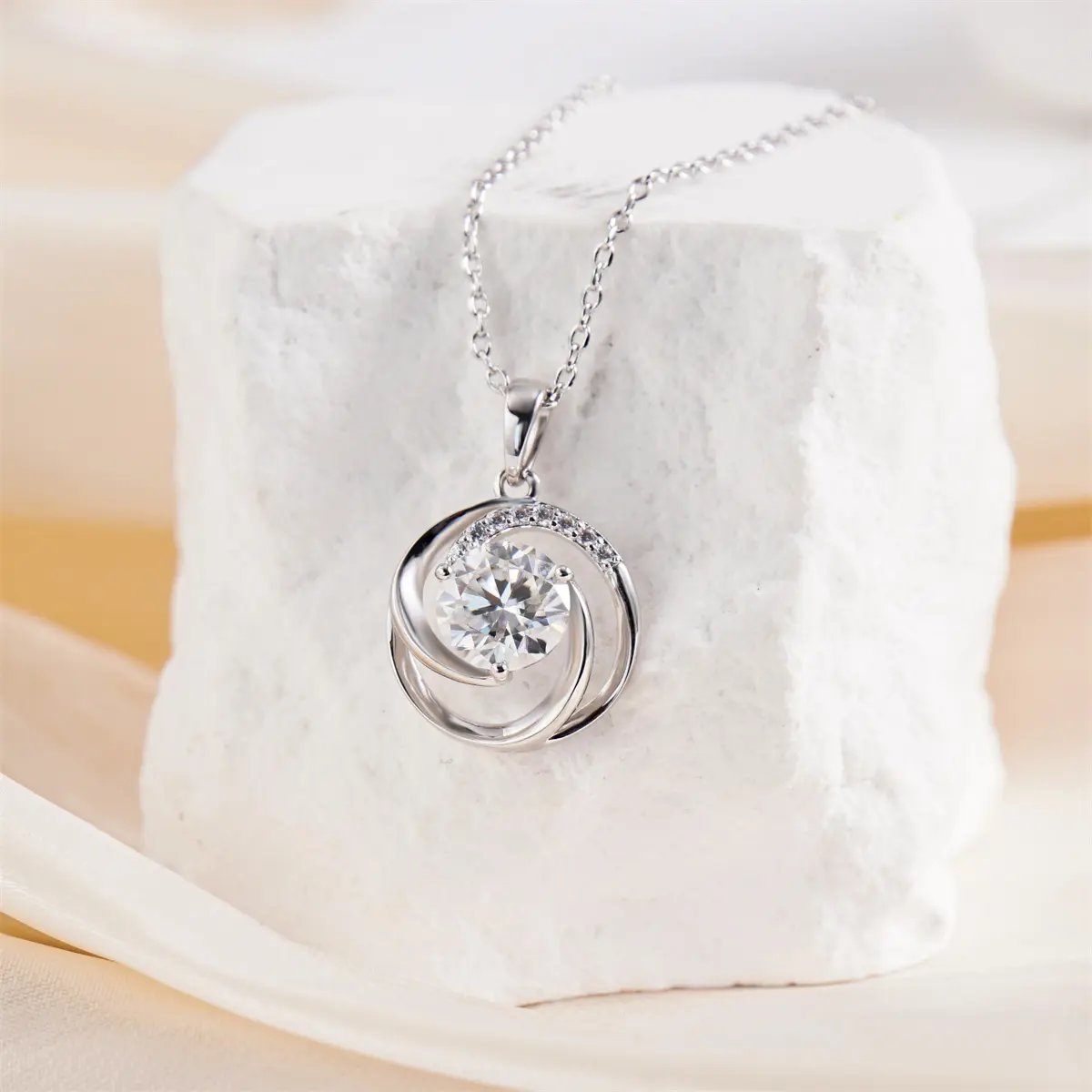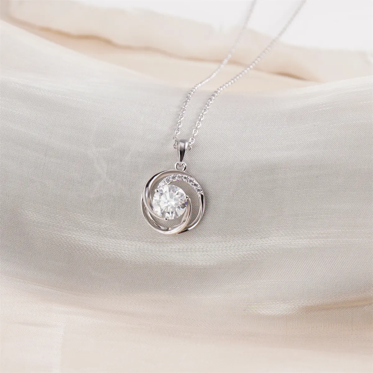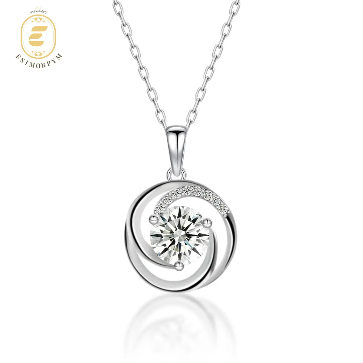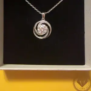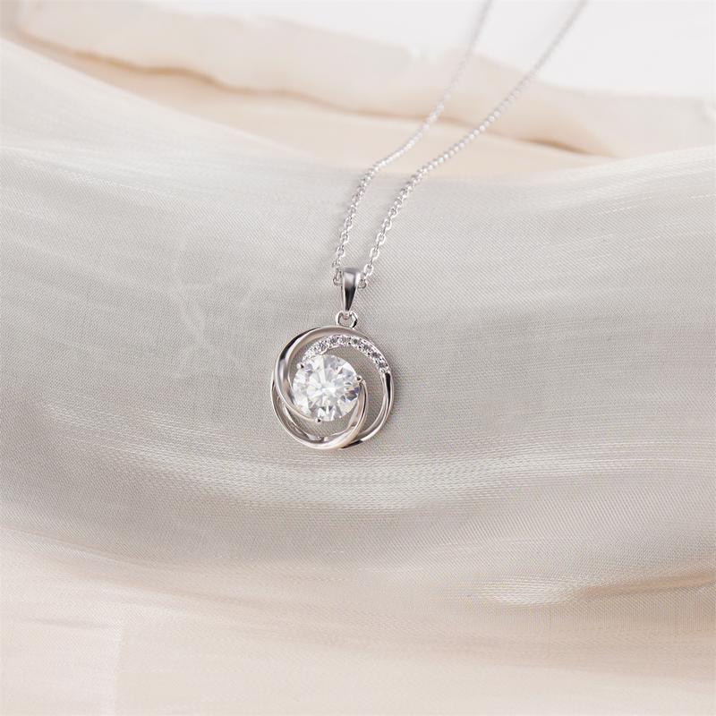 This pendant showcases a graceful swirling motif that embraces a brilliant 2ct round VVS moissanite, creating a luminous focal point that catches the light from every angle. The upper arc is accented with delicate pavé details, adding layers of shimmer that elevate the pendant’s refined elegance.