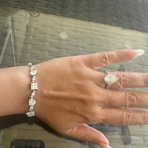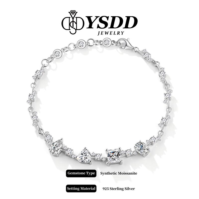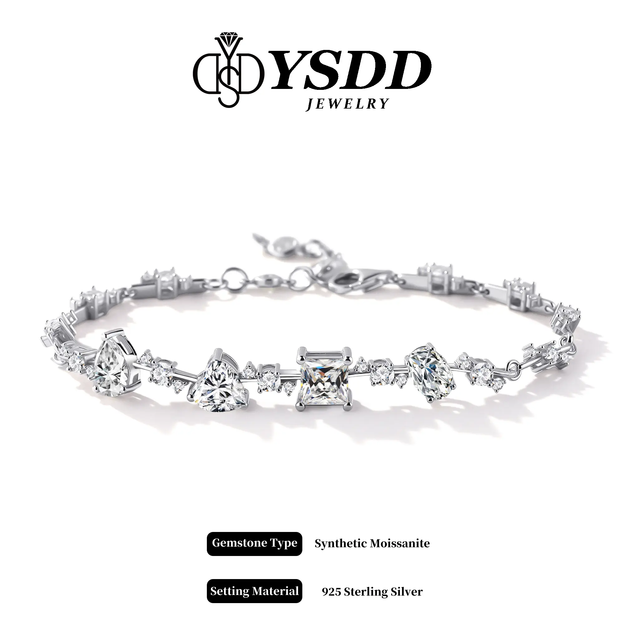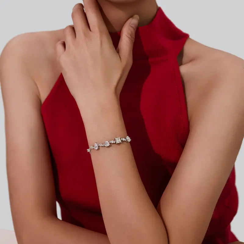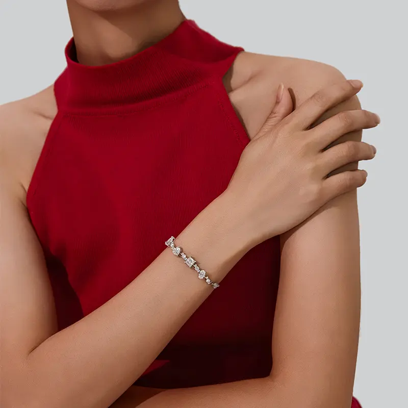 ·925 sterling silver bracelet features synthetic moissanite stones. The main part is 4 pieces of irregular moissanite stones, including oval,square,heart and pear shape, and feature 1ct (4CT total)with a clarity of VVS1-2 and a grade of D/E.
