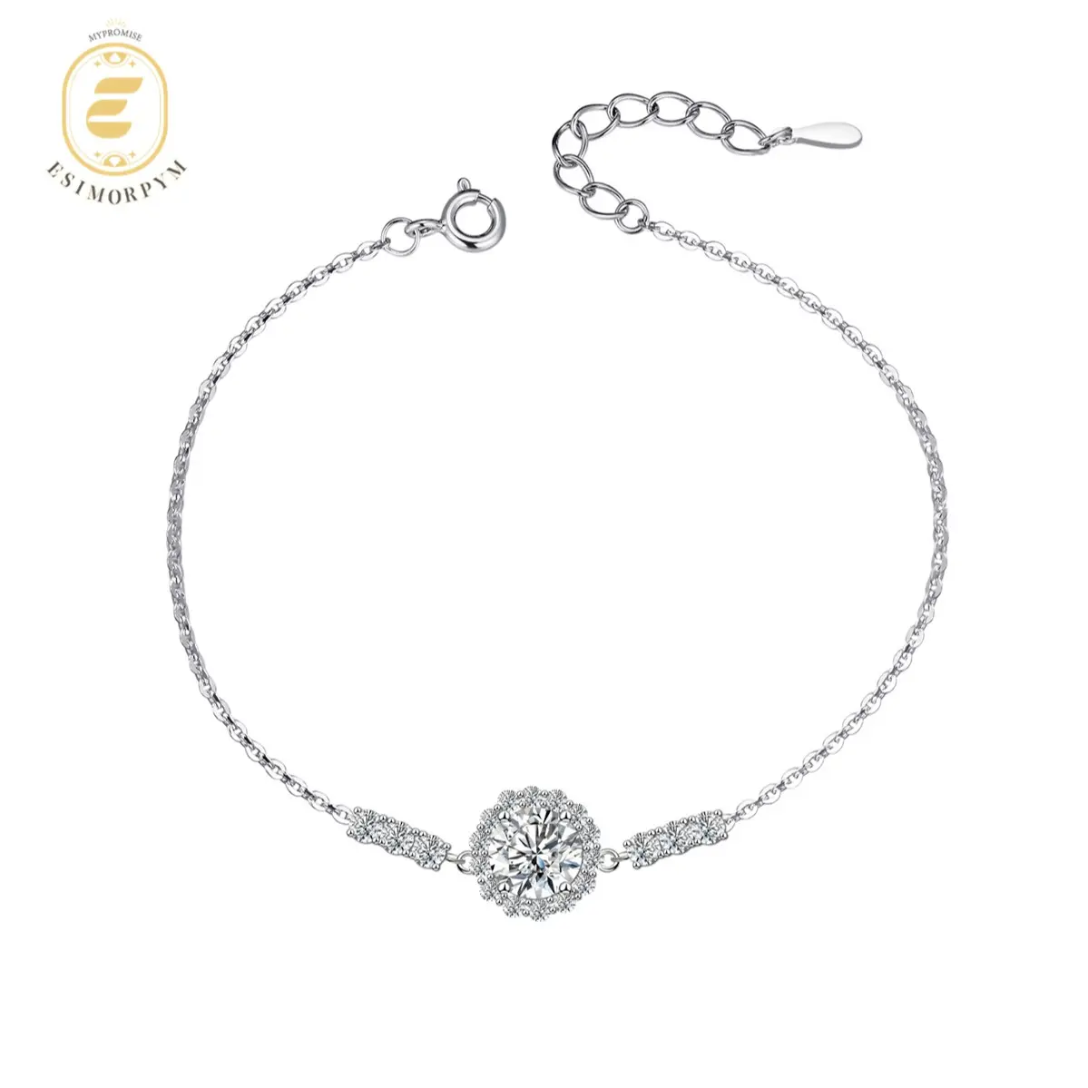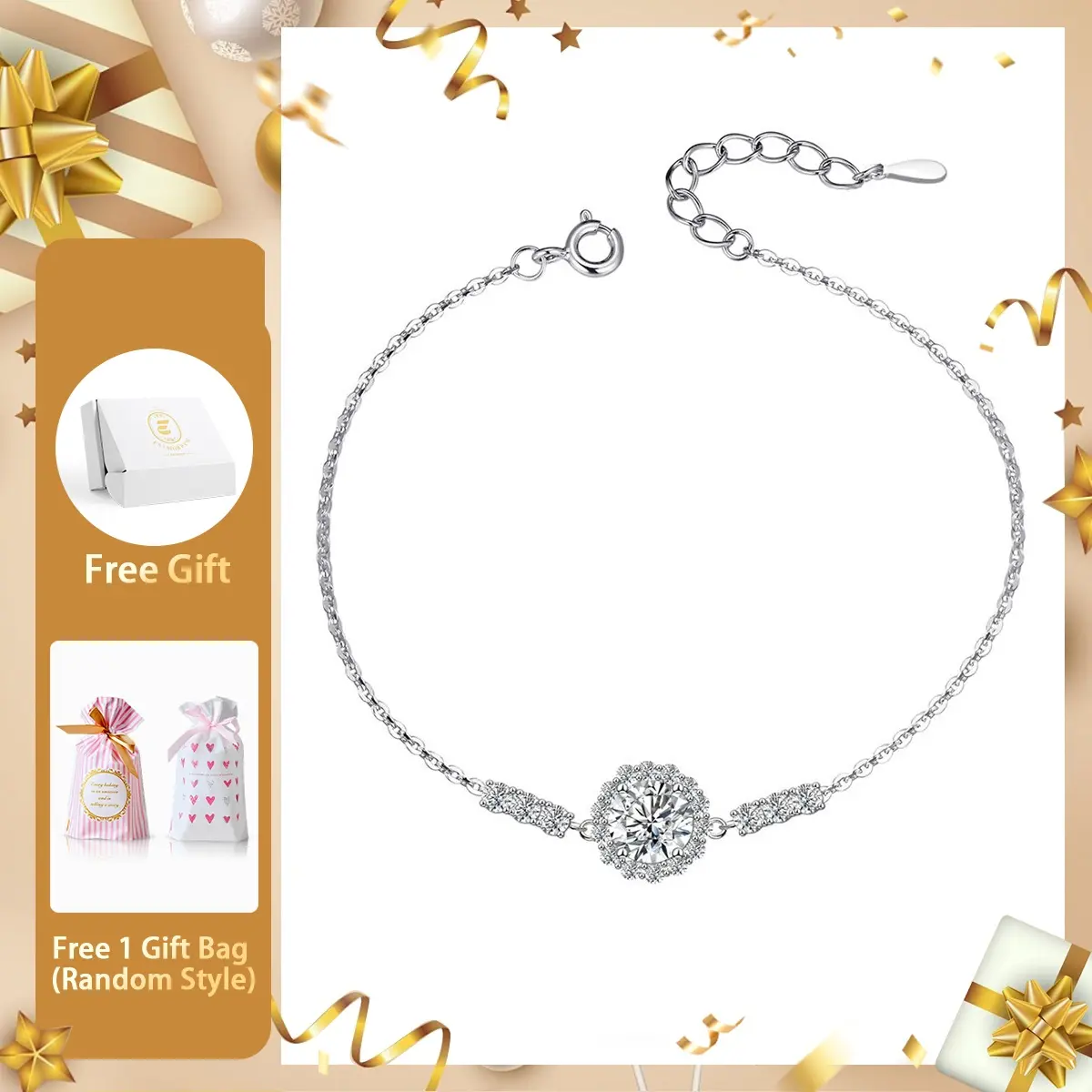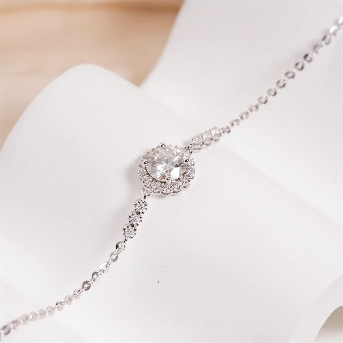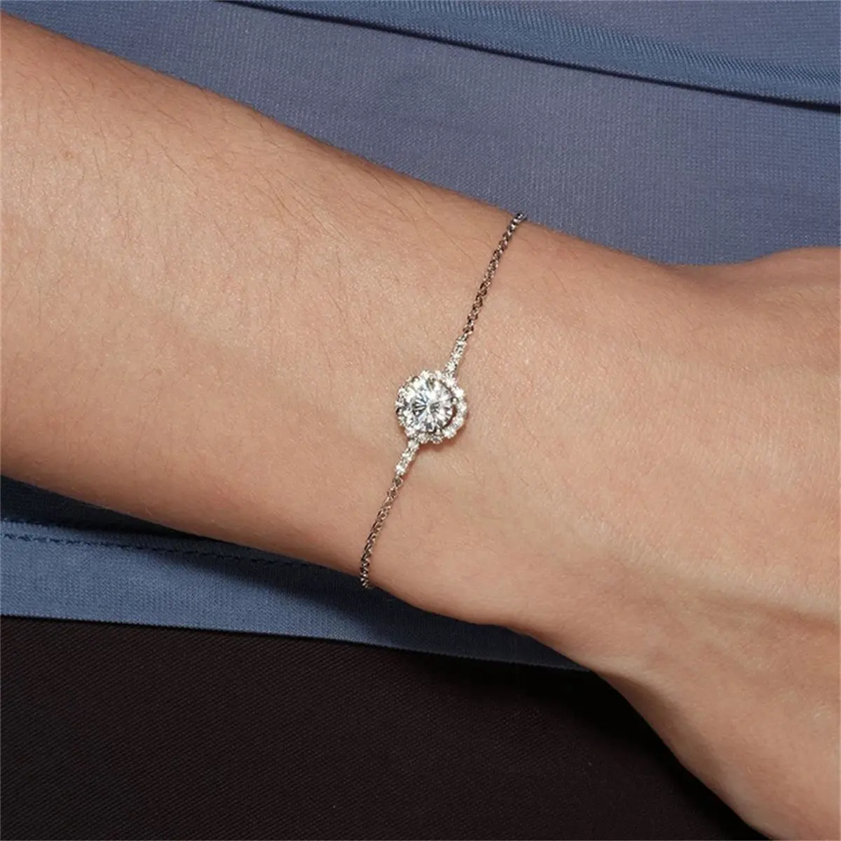 ·This bracelet is centered with a brilliant round-cut D color VVS moissanite, framed by a delicate halo of finely set stones that amplify its fire and clarity. The symmetrical design flows naturally along the wrist, allowing the central sparkle to take focus while subtle pavé accents add layers of soft, refined brilliance.