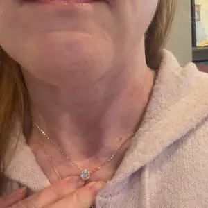 Chain length is too long. Description doesn’t say how long it is, but goes down too far and gets covered by clothing. Otherwise, the moissanite shines beautifully.