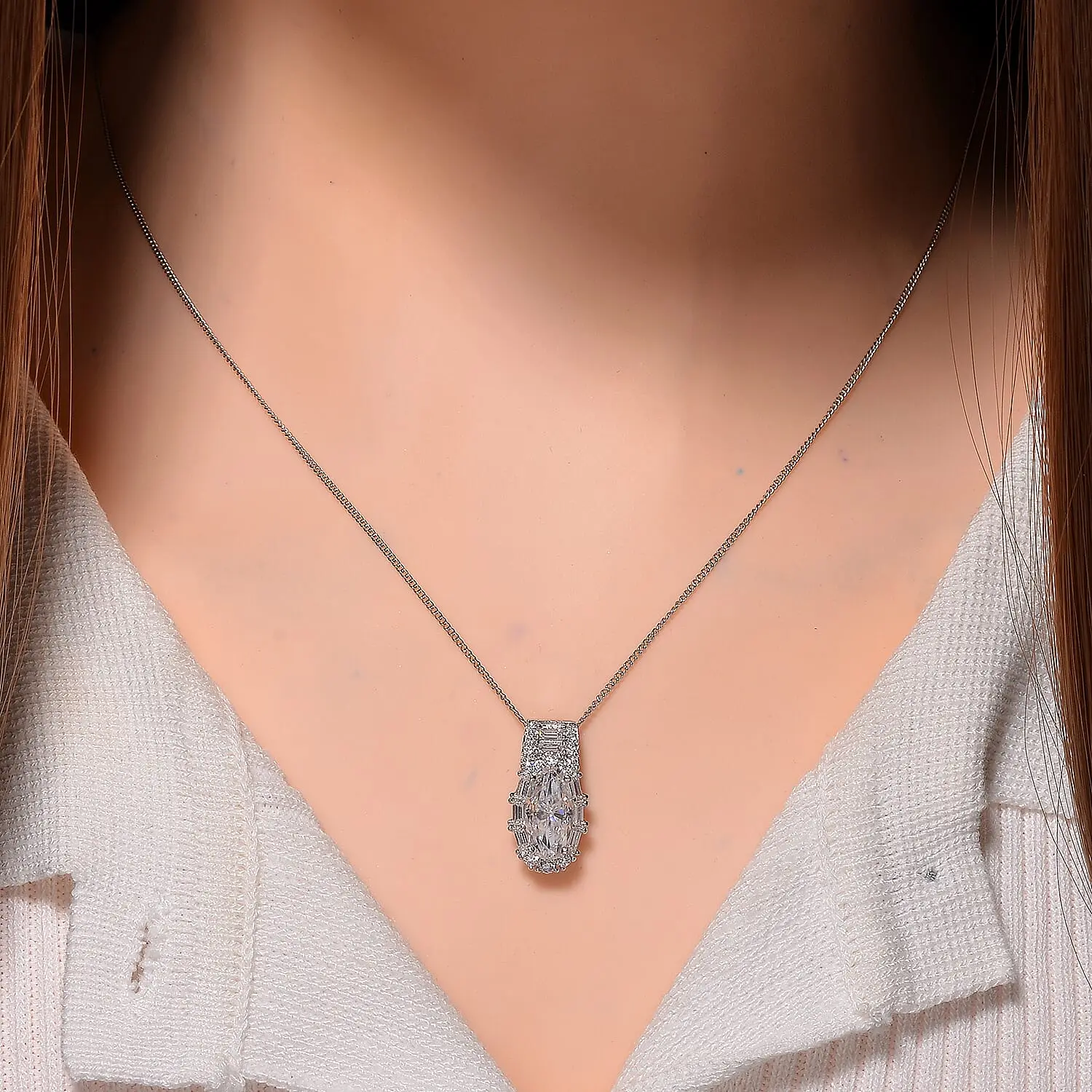 Enhance your collection with this moissanite pendant necklace in sterling silver. The brilliant moissanite stones add luxury and sophistication to any outfit. This silver necklace offers elegance for any occasion. This versatile piece will elevate both your casual and formal styles.Details | Brilliant shine from the coveted moissanite gemstone | Ethical elegance with lab created gemstones | Lasting shine with durable rhodium plating | Affordable durability with 925 sterling silver | Secure hold with reliable lobster claw clasp | Versatile 20 inch chain length for wear