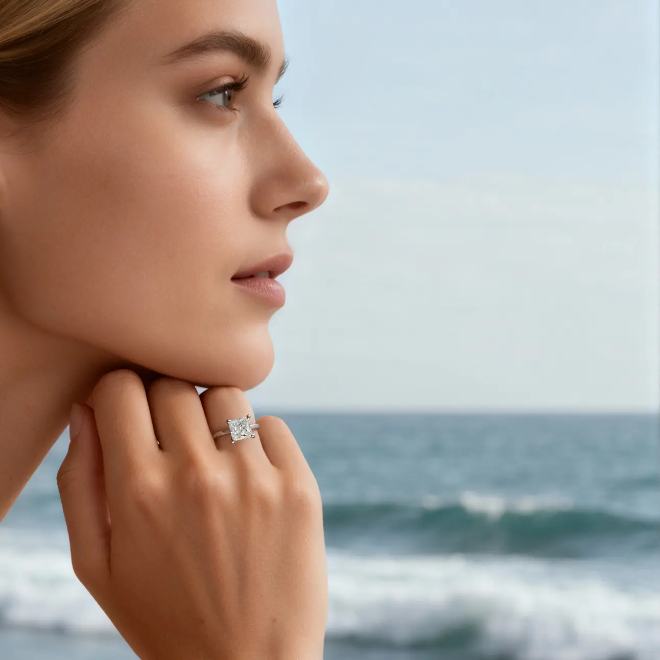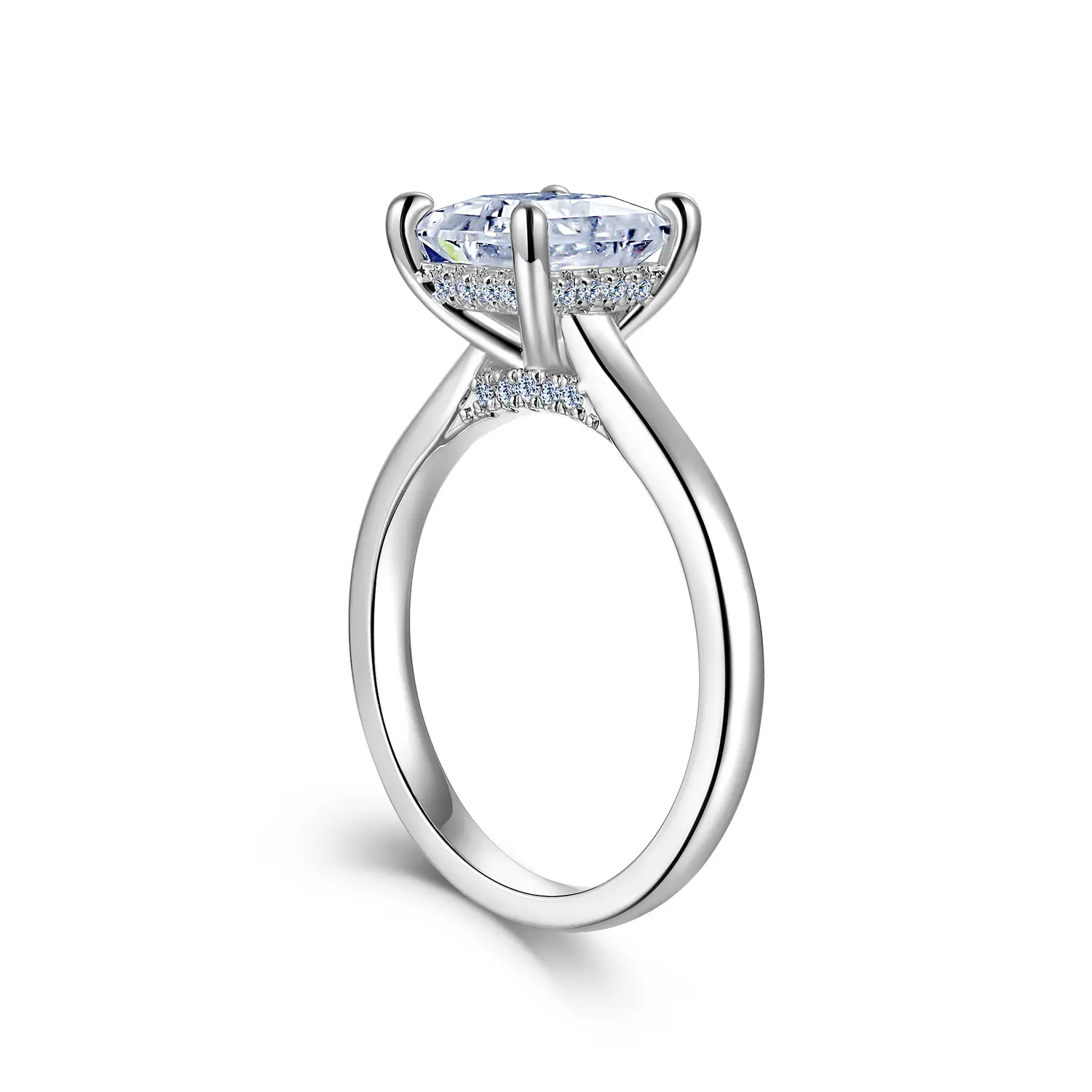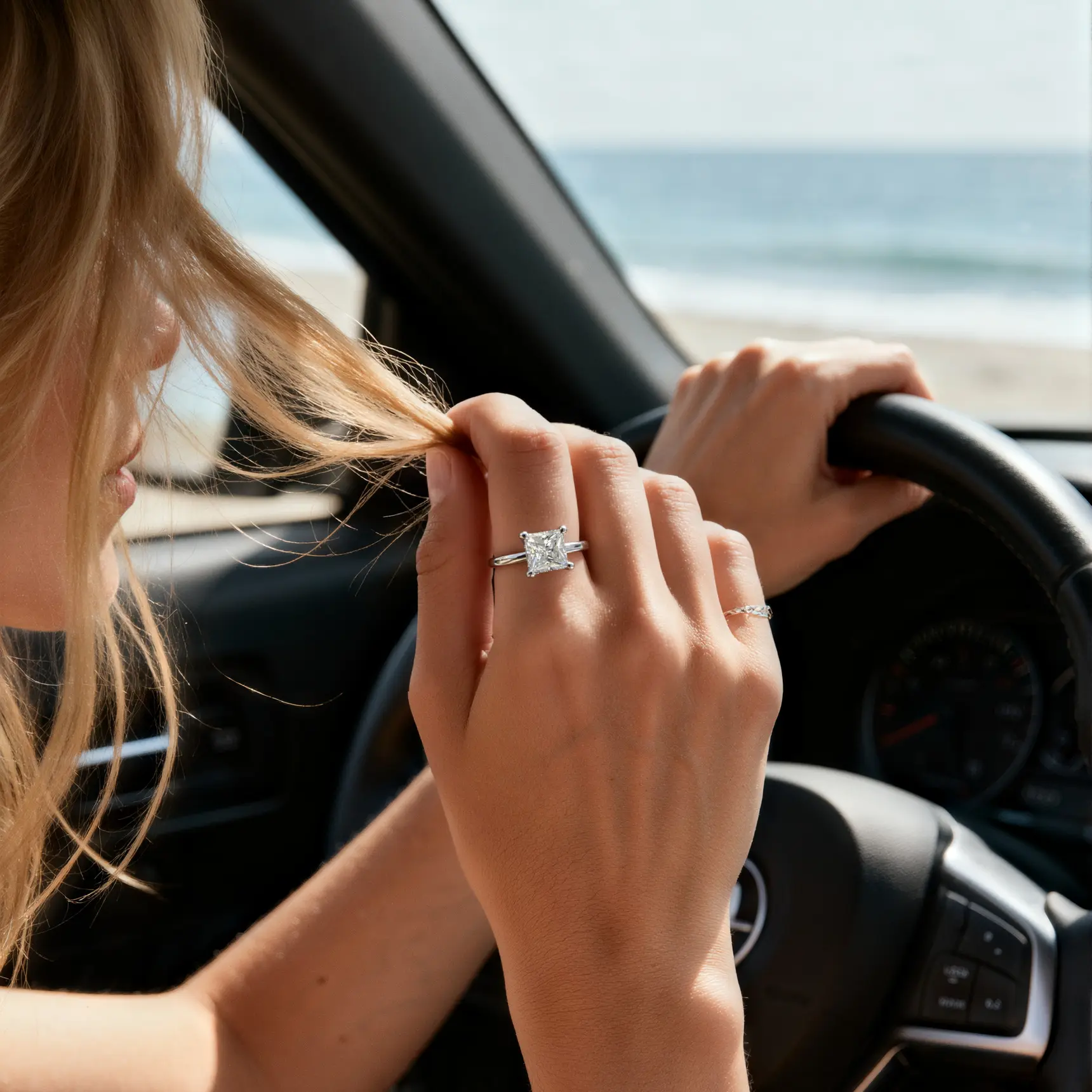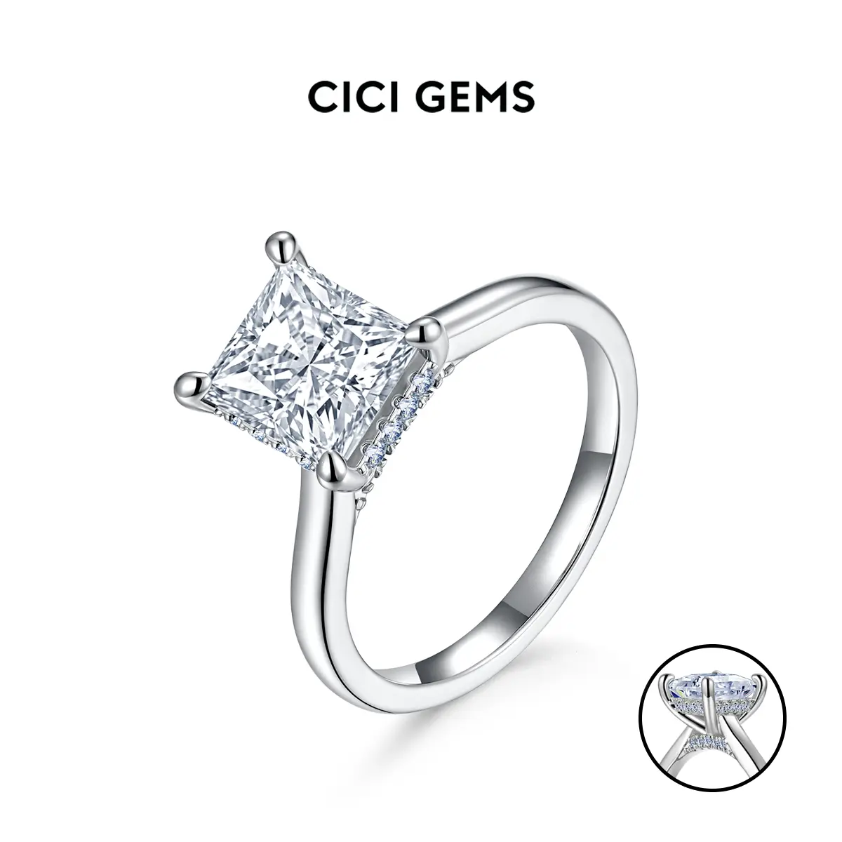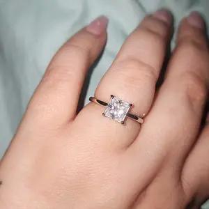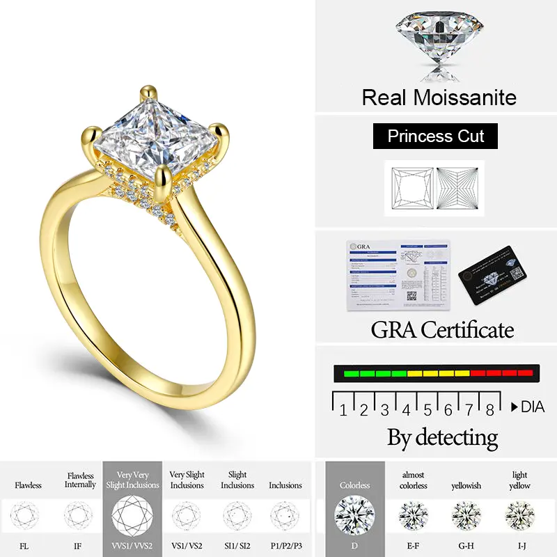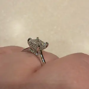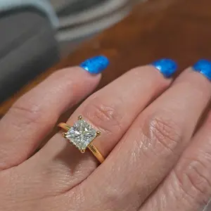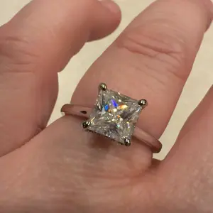 It is the most exquisite princess cut. It’s shiny and looks real. It catches the light. It doesn’t get caught on clothes so far. I’ll see how the wear and tear goes. The hidden halo is beautiful and doesn’t take away from its beauty. It doesn’t sit too high.