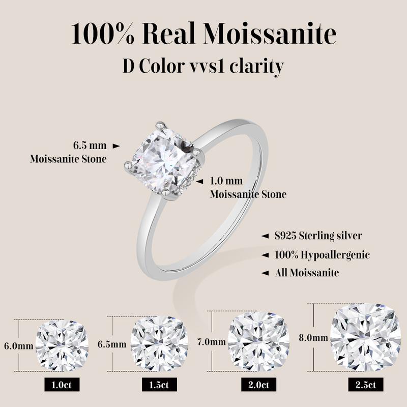 ✨ Introducing the ATTAGEMS Cushion Cut Moissanite Ring, available in 1.5ct and 2.5ct options. This exquisite piece boasts a DVVS1 color, guaranteeing brilliance and clarity. Crafted from 925 Sterling Silver, it's a durable and luxurious choice for women. Perfect for engagements or weddings, this ring exudes timeless elegance.