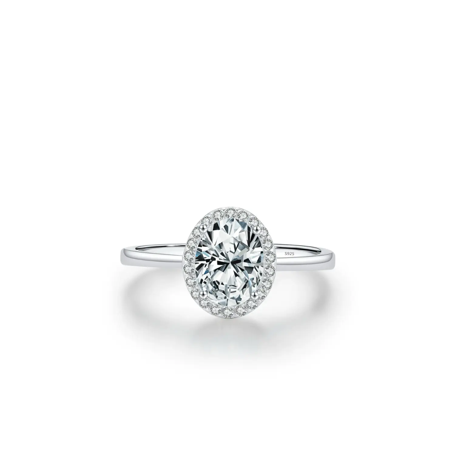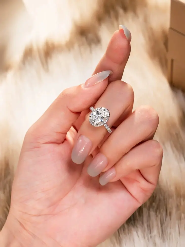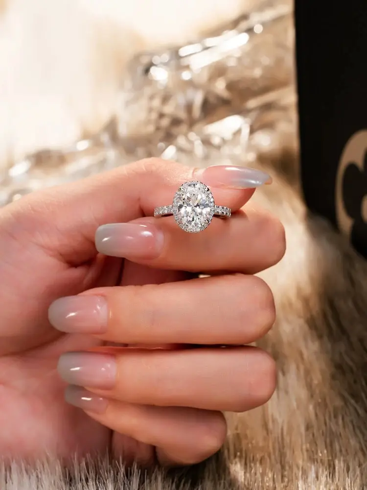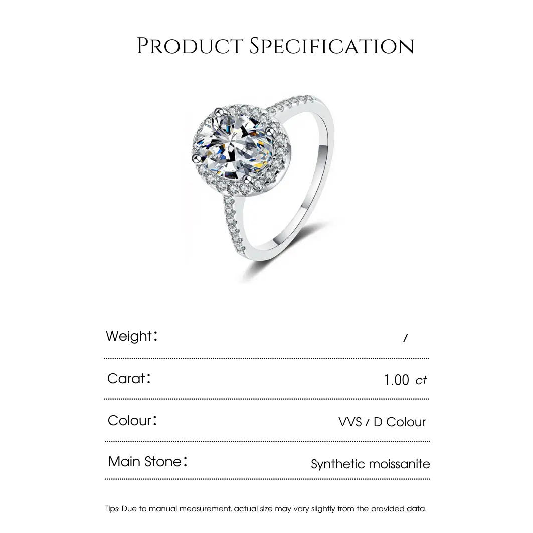 This 925 sterling silver moissanite ring features an elegant oval design, with a dazzling central moissanite stone surrounded by a halo of sparkling gems, exuding a sense of luxury and sophistication. Crafted from 925 sterling silver, the ring offers durability and long-lasting shine, symbolizing eternal love.