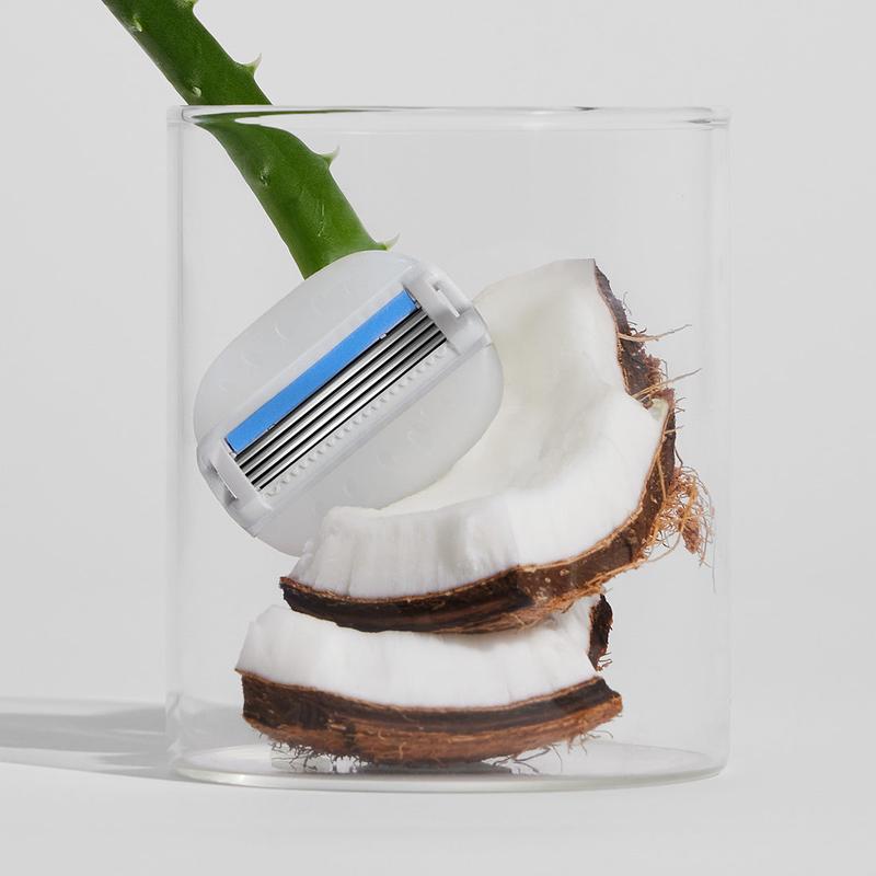 Get a close and comfortable shave in one step—no shave gel needed! Just add water to activate moisture bars enriched with aloe, coconut, & shea butter. Four sharp stainless blades remove hair and a flexible moisture bar glides over curves.