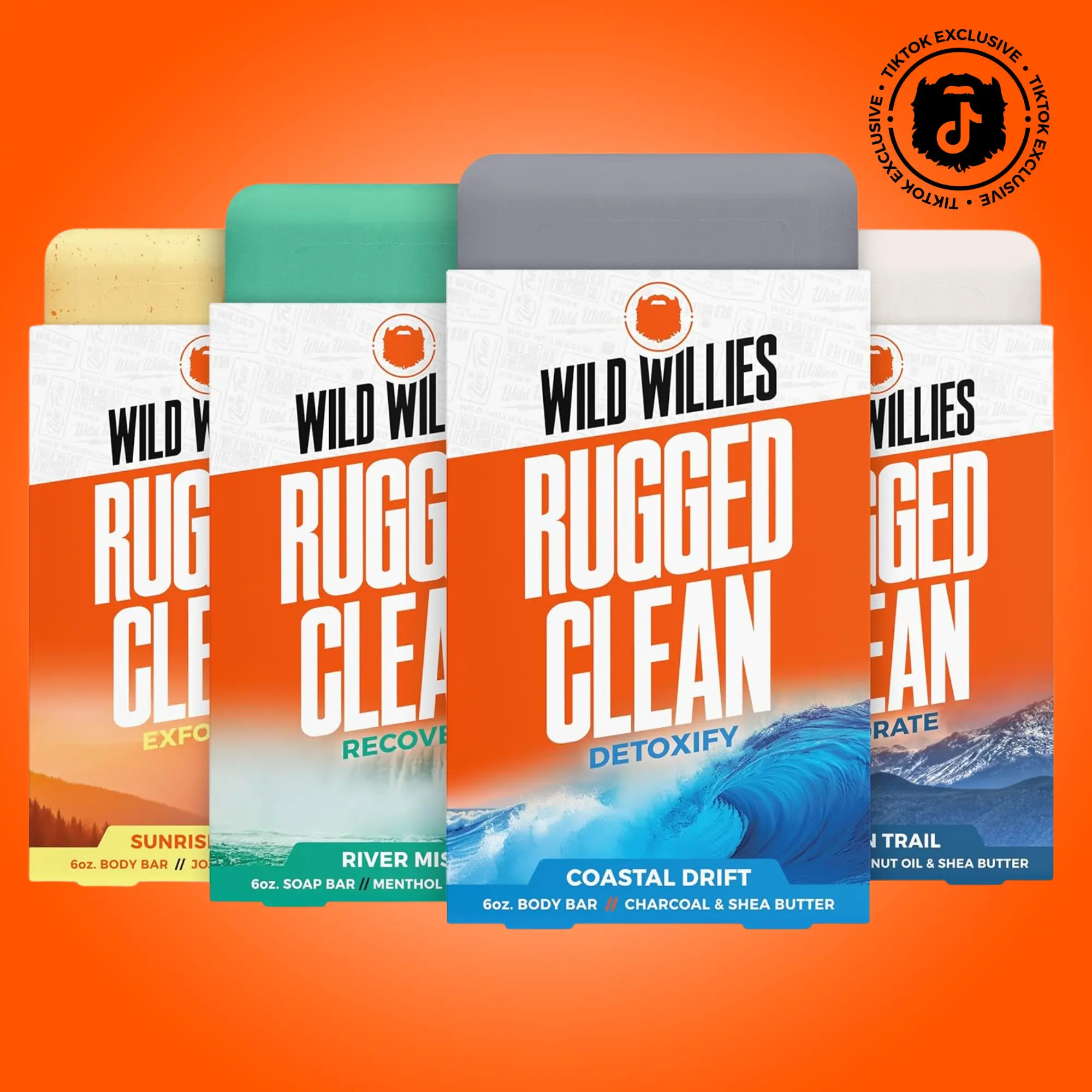 Four bars. Four experiences. All built for the man who works hard and cleans up even harder. Rugged Clean Body Bars are French triple-milled for a longer-lasting bar, packed with Shea Butter, Coconut Oil, Charcoal Powder and Jojoba Oil — deep hydration, real odor protection and zero harsh chemicals. This isn't your average drugstore soap.