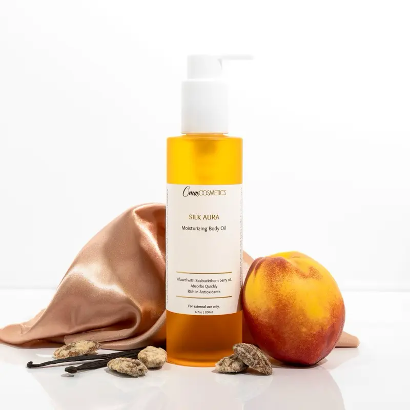 Silk Aura: Silk Aura opens with the celebratory sparkle of champagne, the delicate elegance of freesia, and the rich fruitiness of black currant. Its heart blooms with a luscious blend of nectarine and praline, accompanied by the romantic bouquet of jasmine, orange blossom, and May rose. This body oil settles into a luxurious base of comforting vanilla and sugar, smooth sandalwood, sensual musk, and modern amberwood. This scent captures the essence of a wedding day, timeless and romantic, as smooth and sweet as silk.
