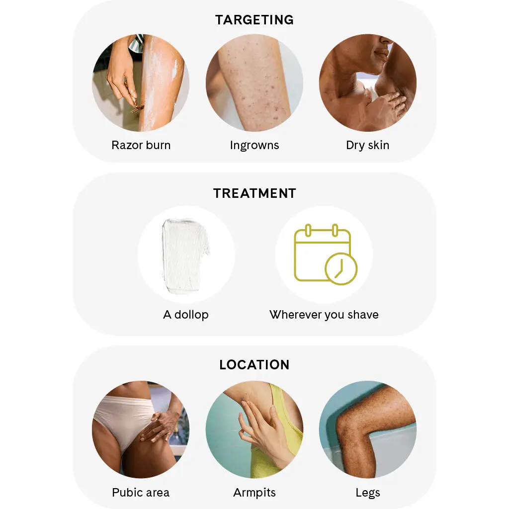 This moisturizing shave cream is designed to protect, soothe, and prevent ingrown hairs and razor burn. It offers maximum glide and zero razor burn, suitable for daily, weekly, or seasonal use. The satin soft finish and whipped, featherlight texture minimize ingrowns, bumps, and irritation. Perfect for shaving anywhere, including the pubic area, underarms, chest, legs, and face.