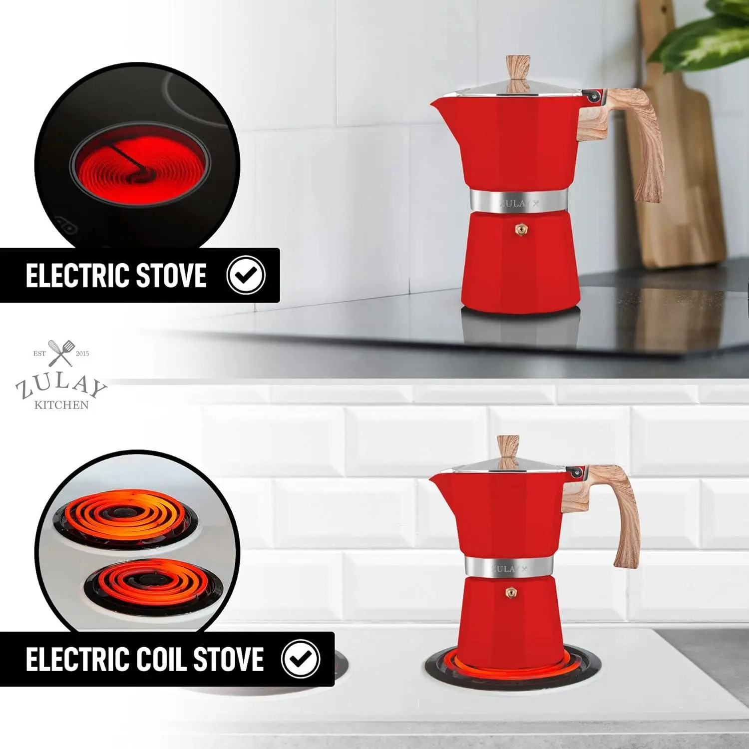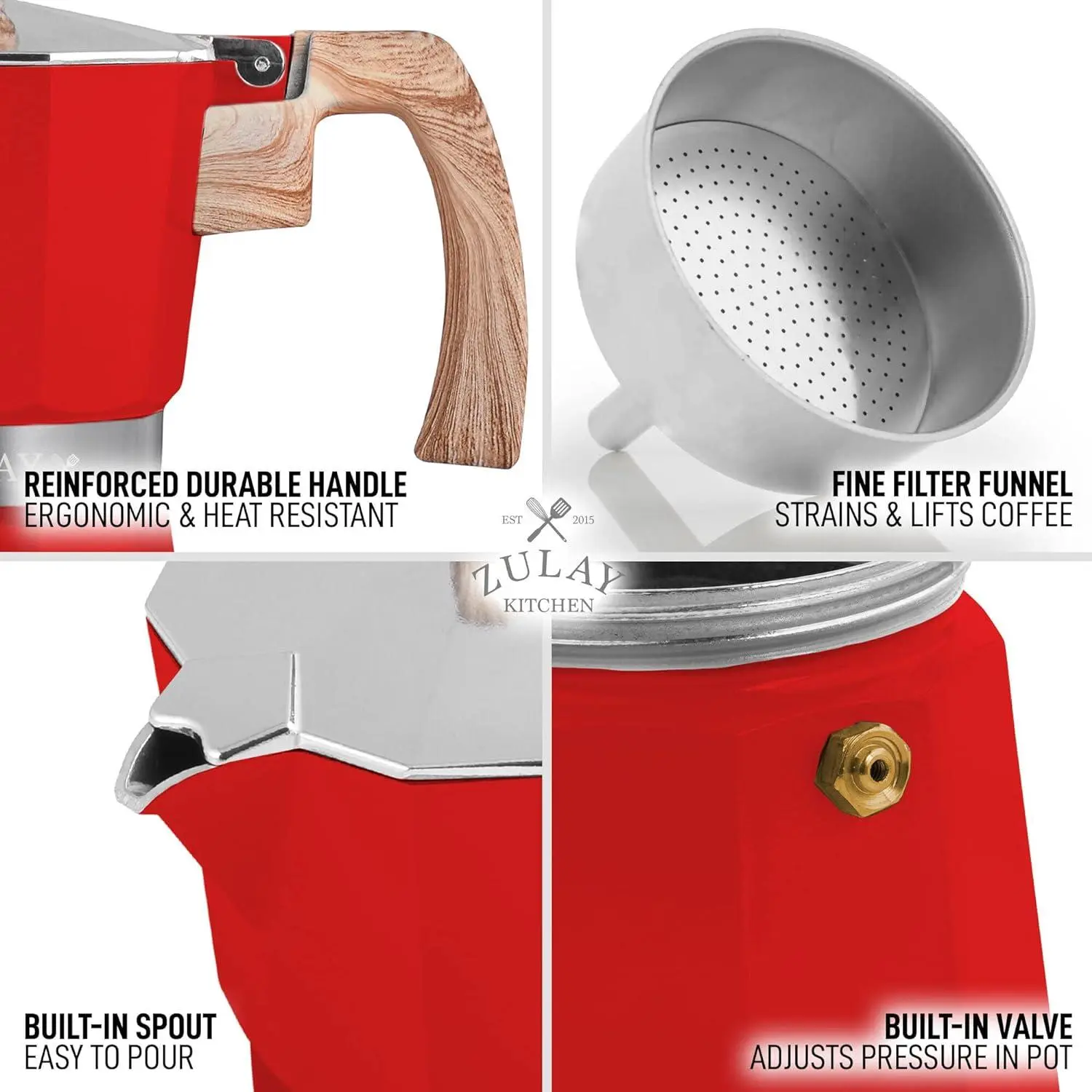 ·Premium Construction: Made from durable, food-grade cast aluminum, ensuring even heat distribution and a velvety coffee flavor, complemented by a built-in safety valve for optimal pressure.
