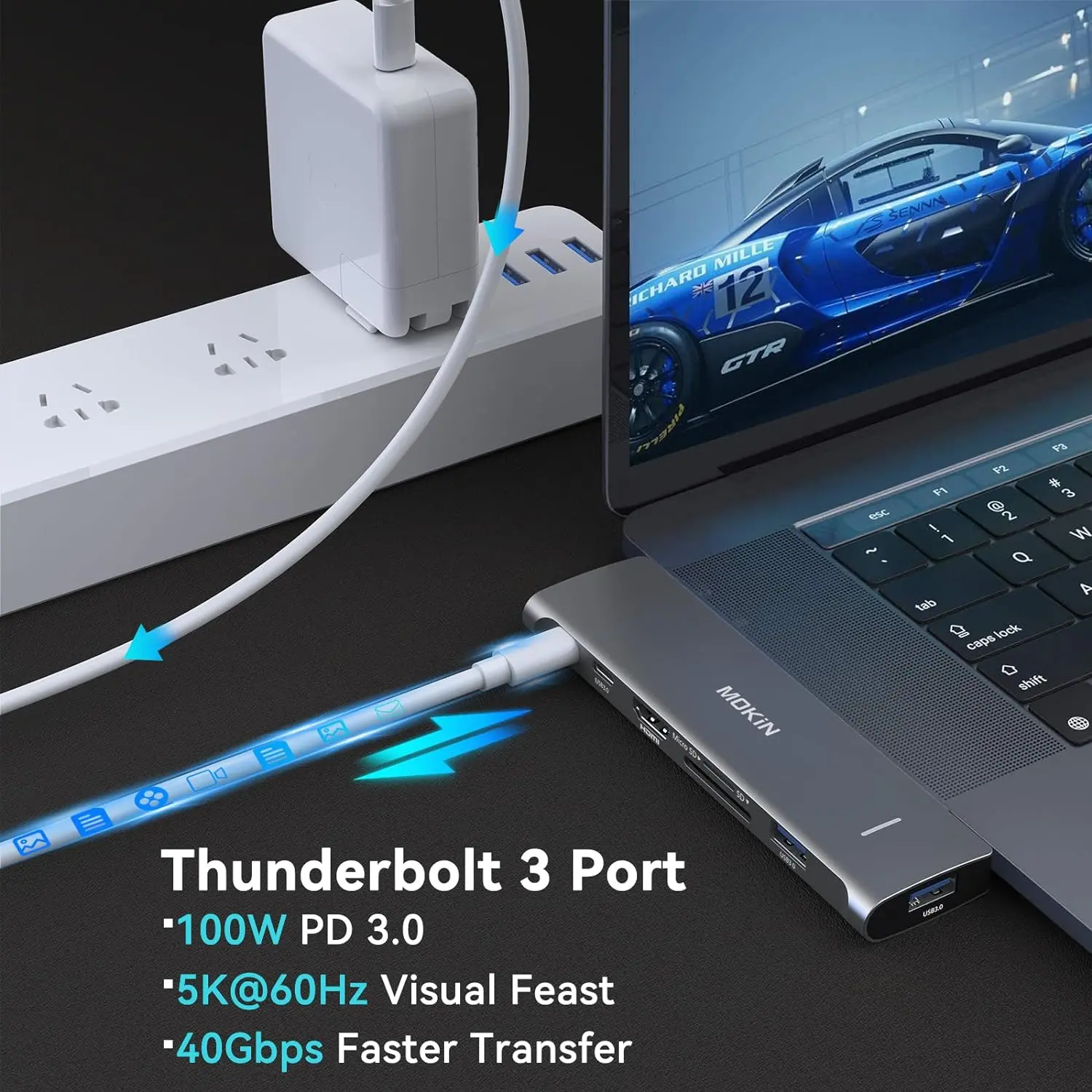 ·Multi-Function Thunderbolt 3: Mac Dongle with a thunderbolt 3(Same as your macbook pro original thunderbolt 3) supports data transfer up to 40Gb/s, up to 5K displays, up to 100W power. Another usb c port is only for data transfer, speed usb 2.0. Convinient if your hardrive with usb c cable. With Aluminium Case & ultra-slim sleek.