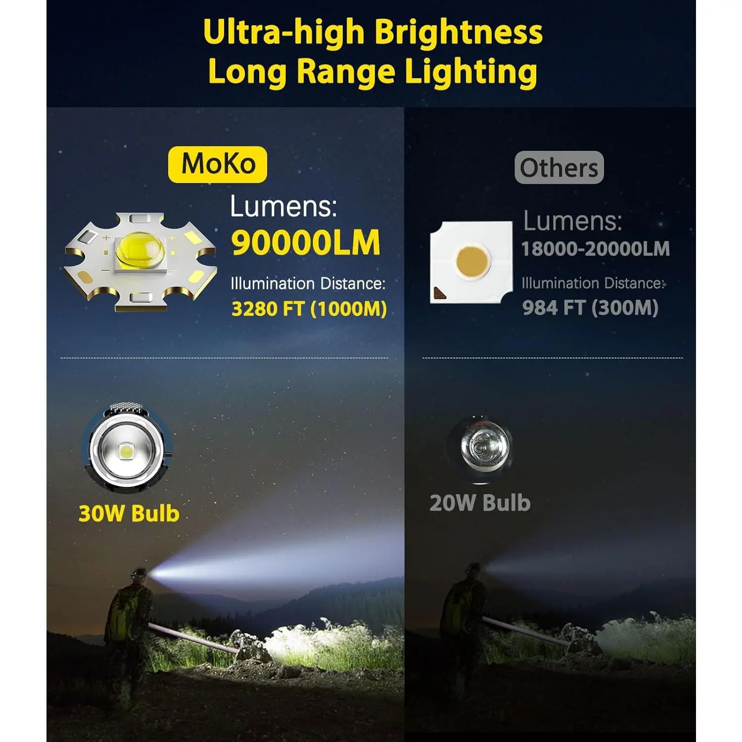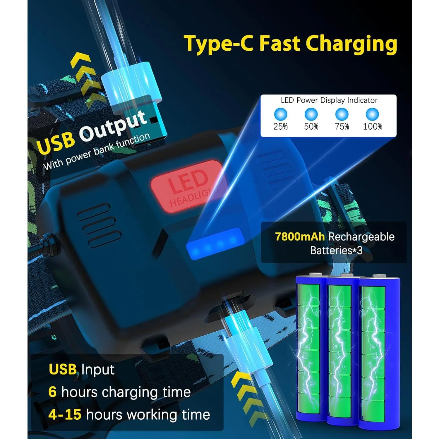 💡 High Lumen Headlamp - With 30W high-power lamp beads, this headlamp delivers up to 90000 lumens of maximum brightness, ensuring clear visibility in dark environments.