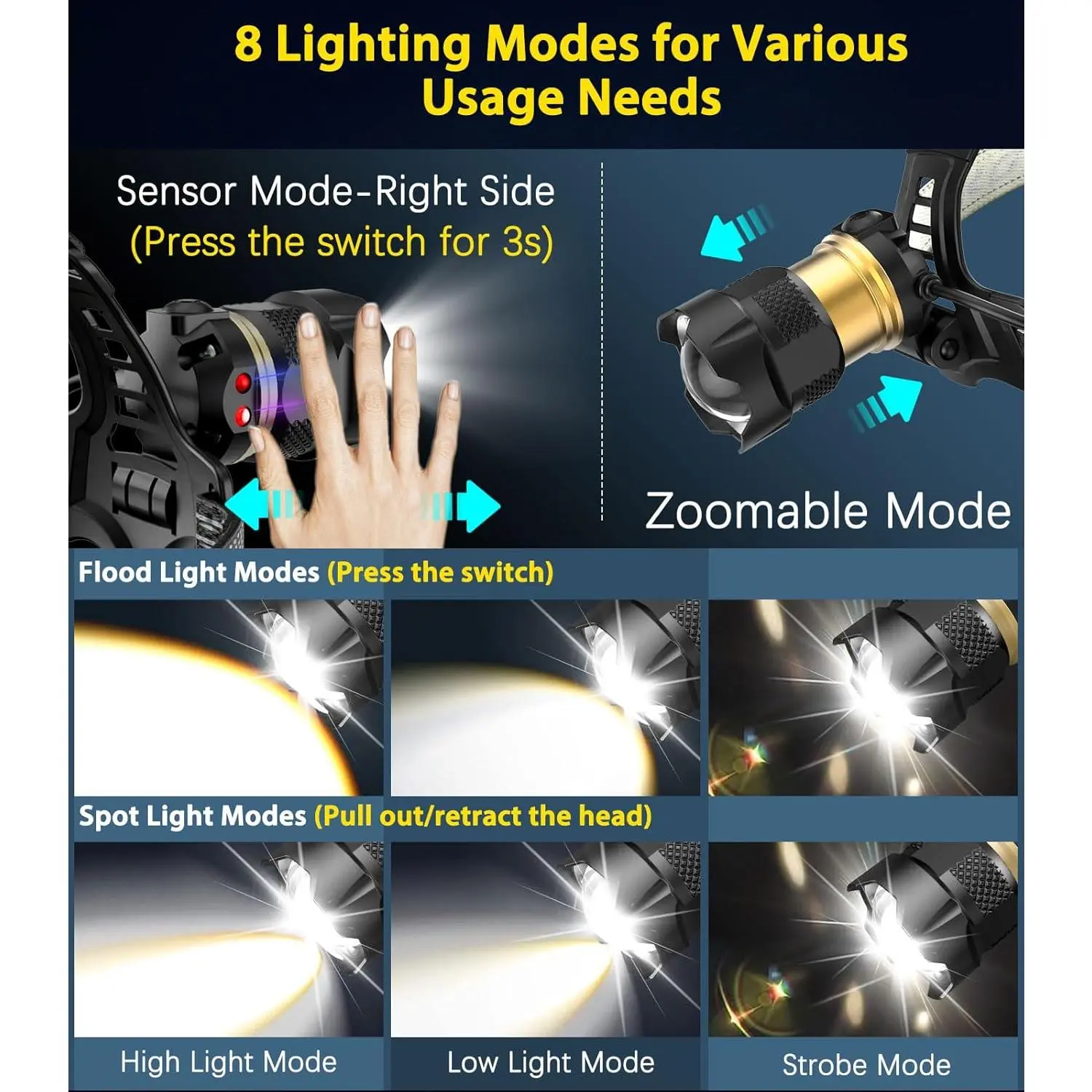 ·Lighting Modes: 8 modes (4 flood, 4 spotlight)