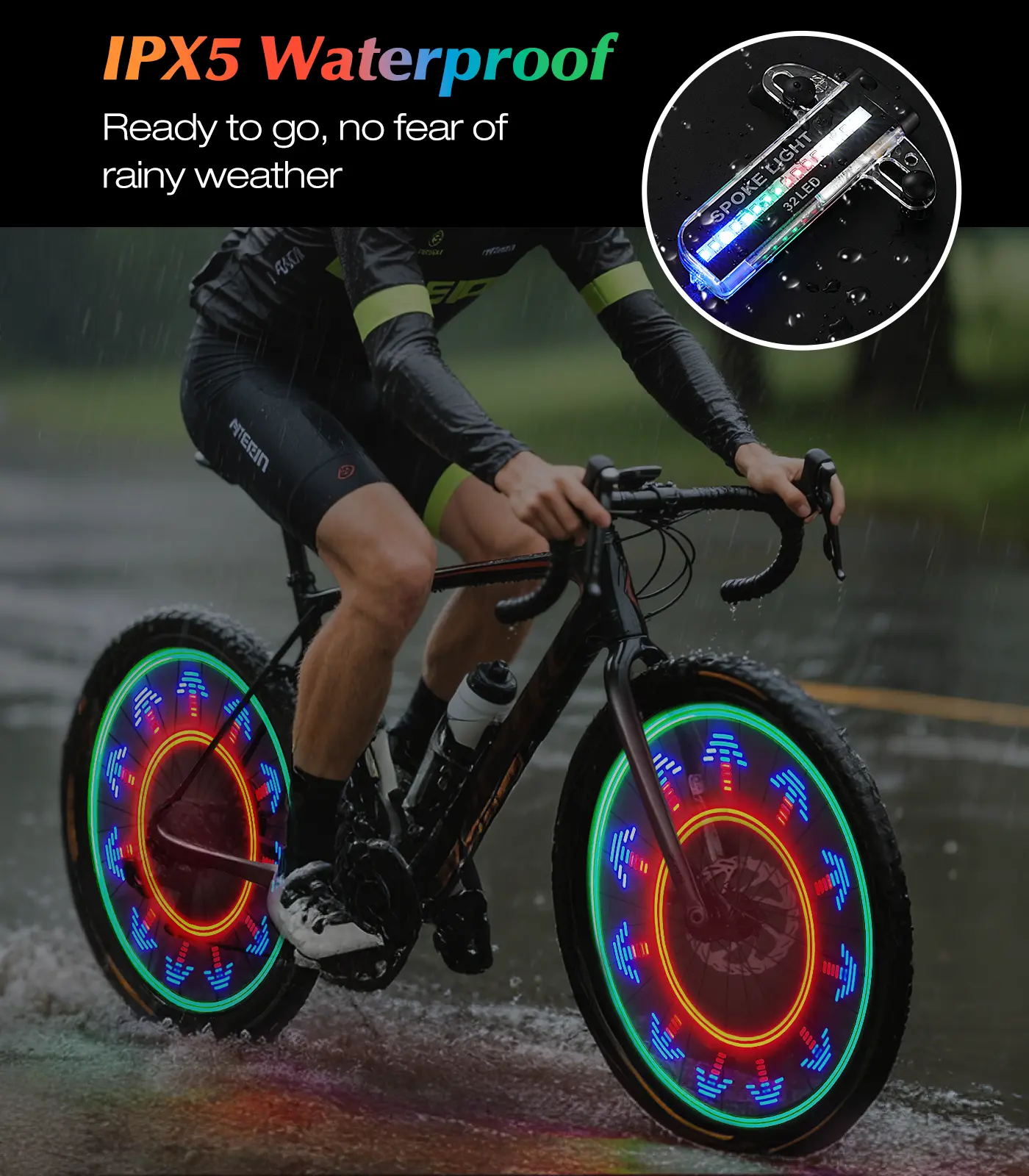·Easy Installation: IPX5 waterproof, suitable for standard 20" and larger spoked wheels. Easy to install without the need for tools.