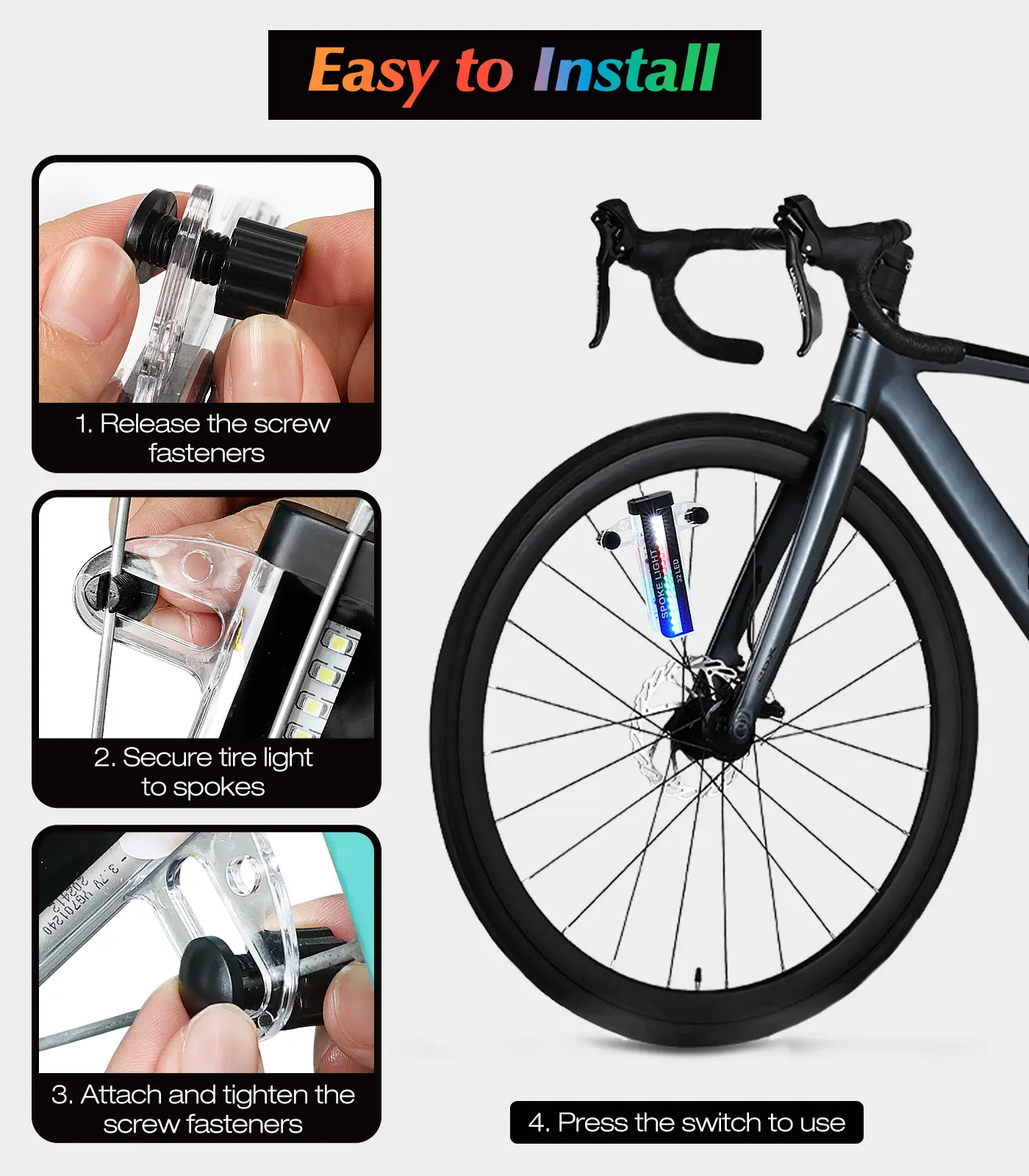 ·Easy Installation: IPX5 waterproof, suitable for standard 20" and larger spoked wheels. Easy to install without the need for tools.