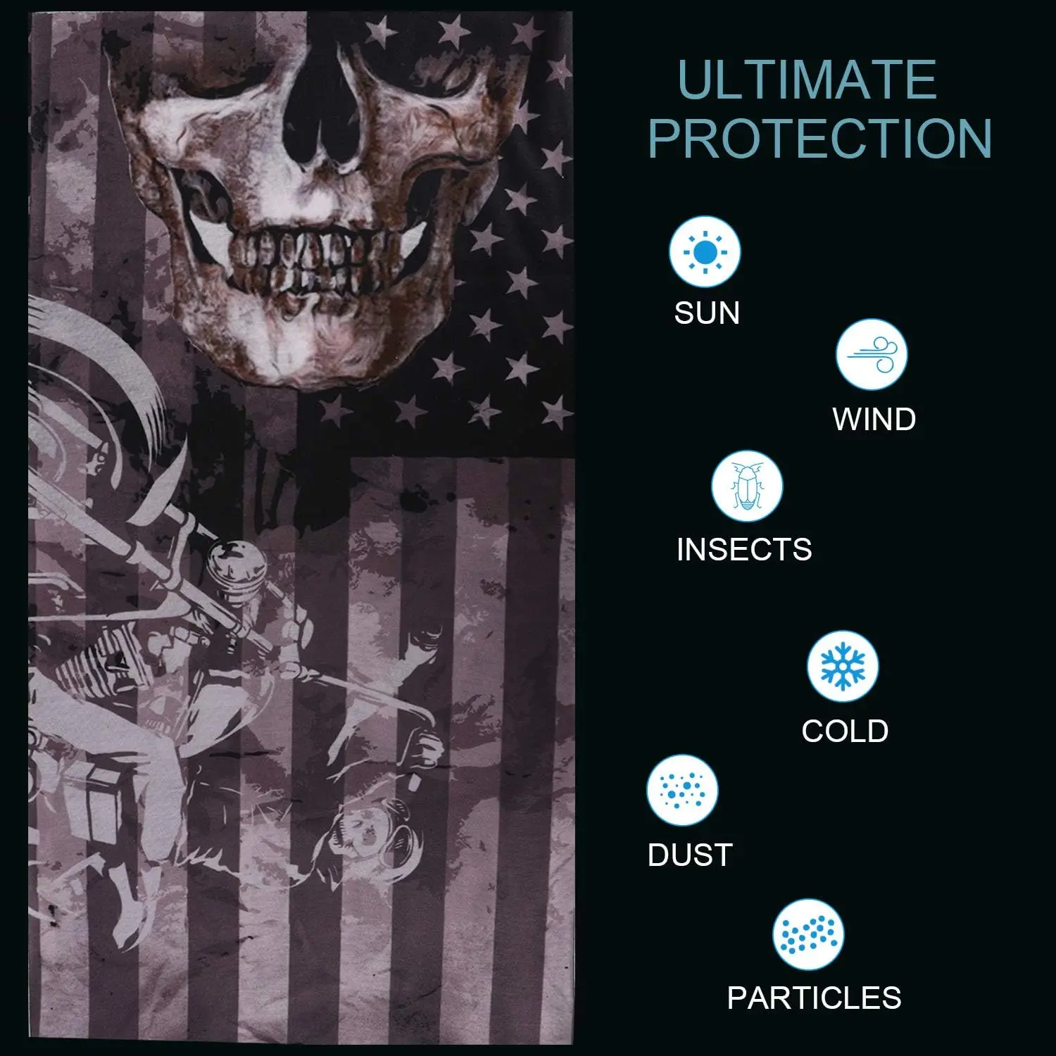 Versatile for different occasions, this headband can be used as a scarf, face mask, balaclava, or helmet liner. It provides protection against wind, dust, and UV rays. The product features a skull bandana design.