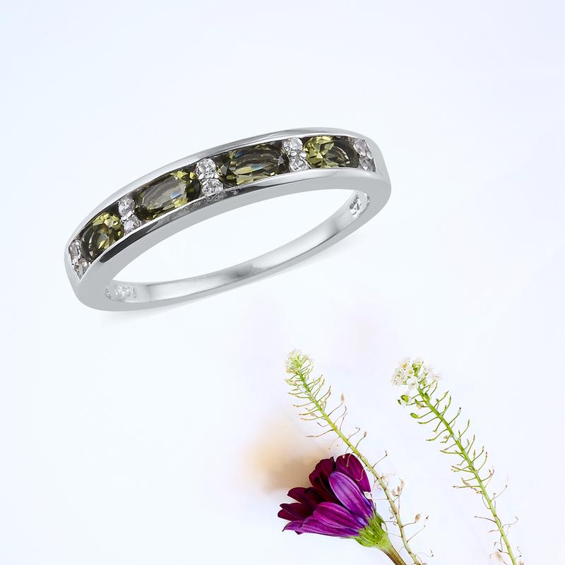 Moldavite & White Zircon Half Eternity Rings in 925 Sterling Silver - Wedding Bands for Women with Platinum Plating Promise Jewelry - Engagement Anniversary Birthday Christmas Gifts for Womens