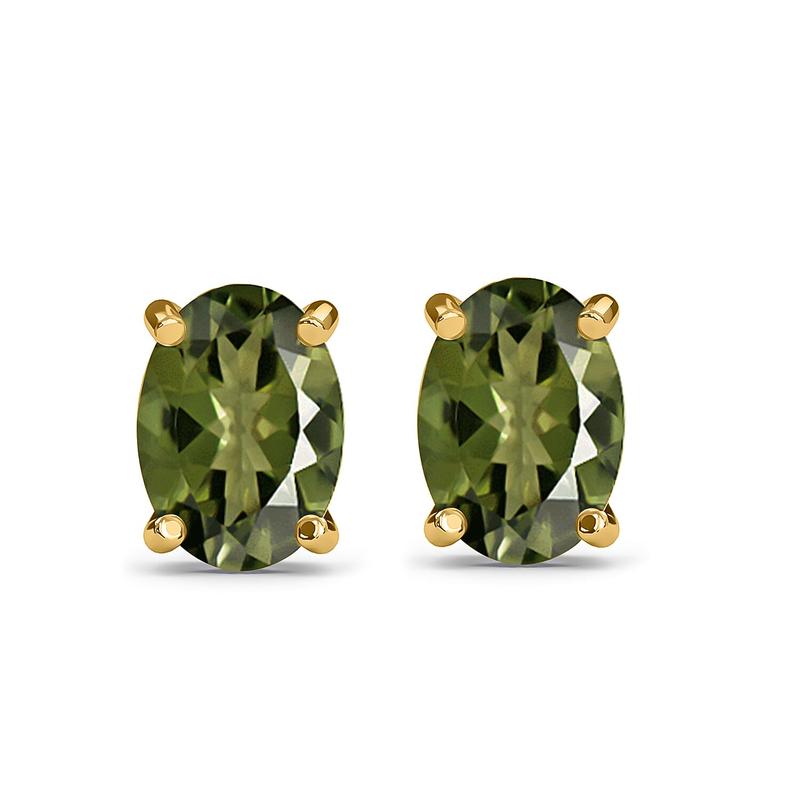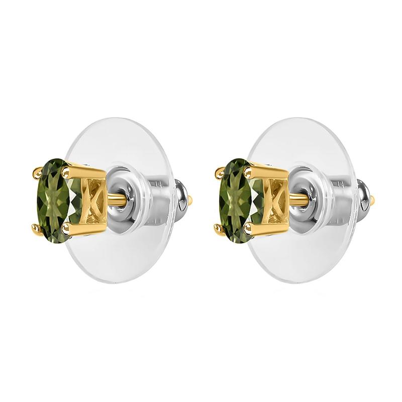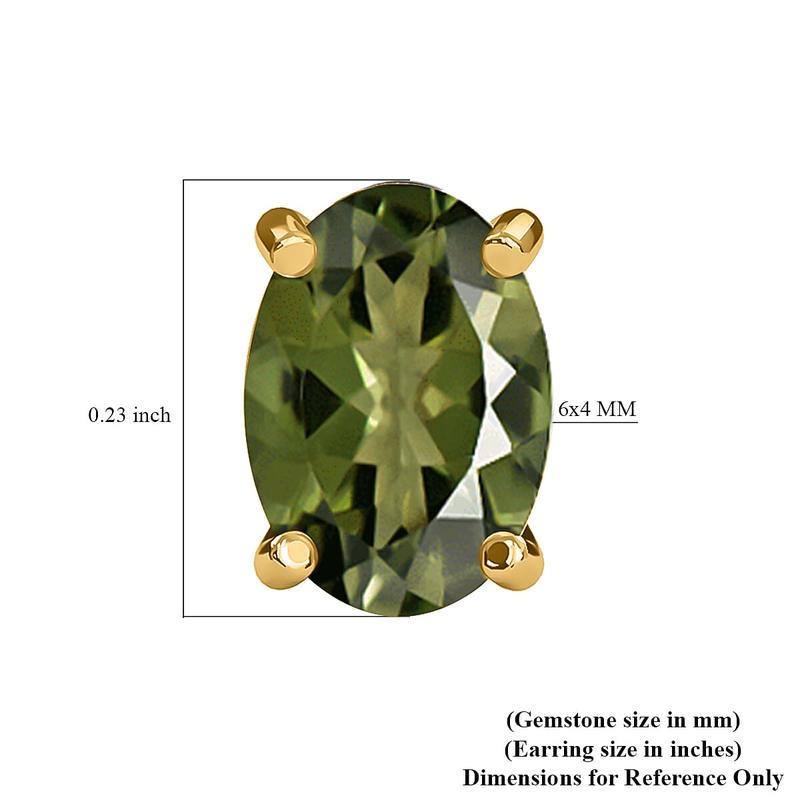 This pair of stud earrings isn't anything like your usual elegant and dainty accessories in your bauble box. The oval shaped gemstone is strategically set to lend a brilliant pop of color when matched with perfect apparel. The azure tones of the moldavite brilliance of the earrings.Highlights | SOLITAIRE INSPIRED STUDS:The studs are inspired by the solitaire theme, distinguished for featuring a single gem | SIGNIFICANCE: Solitaire is commonly associated with forever | TONS OF BLING: The shimmer of moldavite infuses a hefty dose of bling besides creating its spotlight | DUG IN LUXURY:The earrings are craved in platinum plated sterling silver, appealing with their luxurious tones | GEMSTONE SETTING:Prongs precisely hold the gemstones | SECURE FIT:The earrings are backed with push back clasp, ensuring a more comfortable and secured fit | METAL INFO: This piece of jewelry is crafted in sterling silver metal over which vermeil yellow gold/platinum is plated, which enhances the longevity of the earrings | GEM INFO: The moldavite, also known as &lsquo,the gemstones from the stars, is formed from condensed rock vapours after a meteorite impact
