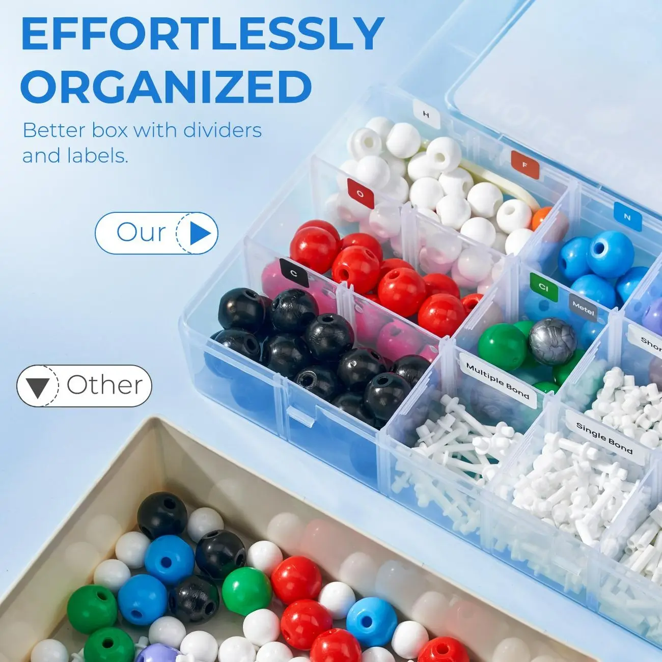 This is an all-in-one molecular model kit that makes learning chemistry easier and more fun. Aditionally, this kit has better boxes with dividers and labels for better storage.