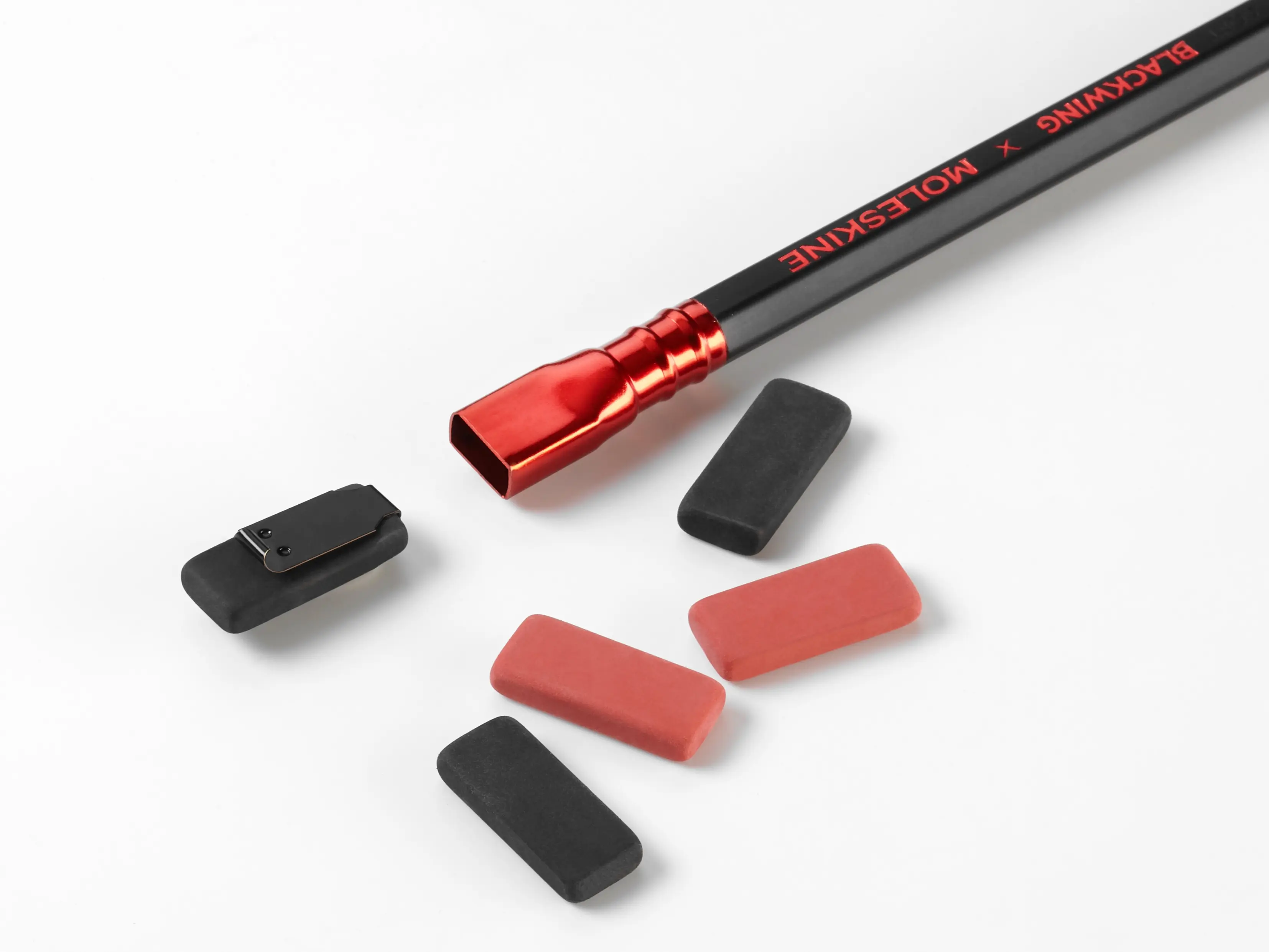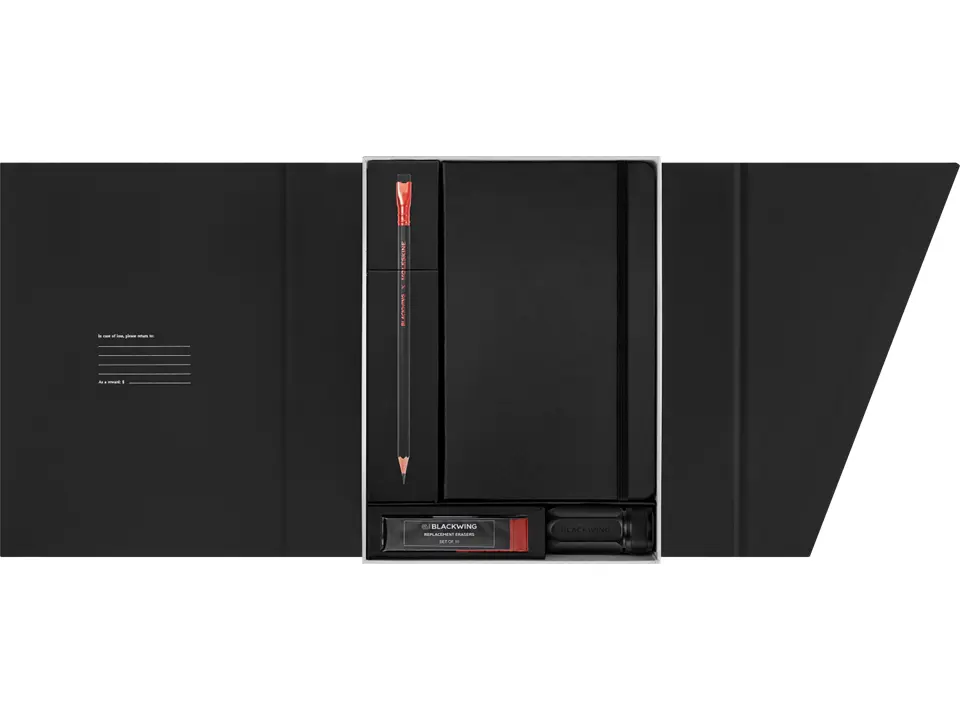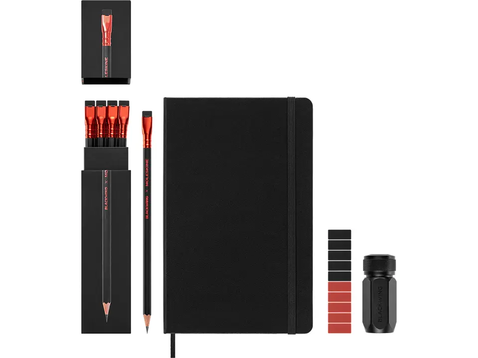 The Creative Set combines Moleskine and Blackwing, offering a beautifully crafted gift. Inside, you'll find a year's supply of 12 Blackwing Soft pencils, a large Moleskine Sketchbook, 10 replacement erasers, and a One-Step Long Point Sharpener. Perfect for graphite drawing, this set has everything needed to start capturing imagination on paper. Blackwing pencils feature a velvety dark graphite core, ideal for bold lines.