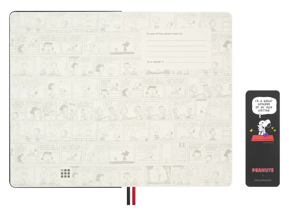 The Snoopy Notebook features Peanuts stickers, a paper bookmark, and custom endpapers. It has an expandable pocket in the back and a 'In case of loss' message. The notebook lies flat, opening at 180° for effortless writing. The paper is from well-managed, FSC-certified forests.