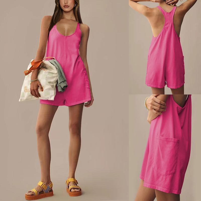 Loose and relaxed fit rompers, sleeveless, racerback cut, baggy style, two side patch pockets, solid color, short jumpers casual summer outfits