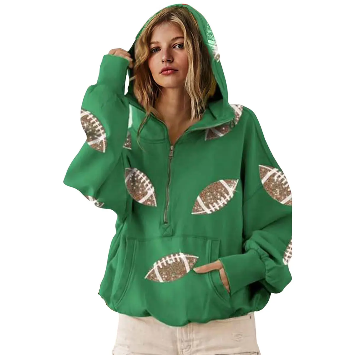 Details: adjustable drawstring hooded collar, half zipper, long sleeves, front kangaroo pocket, oversize fit