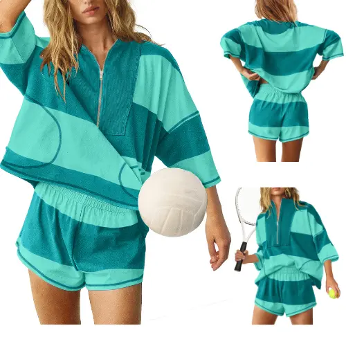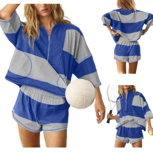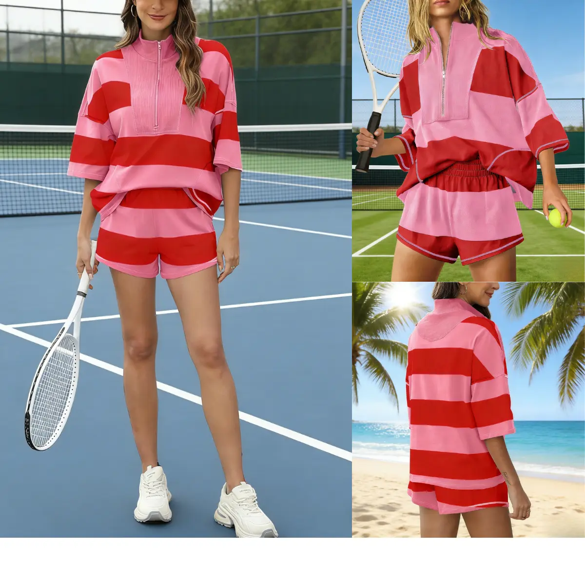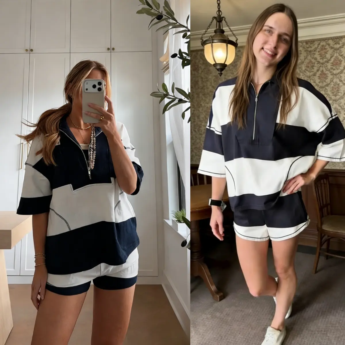 Stand out with the bold wide-striped pattern! The top has a front half-zip, drop shoulders, and side pockets. Matching shorts feature an elastic waist for a custom fit. Both pieces are true to size, with a relaxed silhouette for effortless movement. Order your regular US size.
