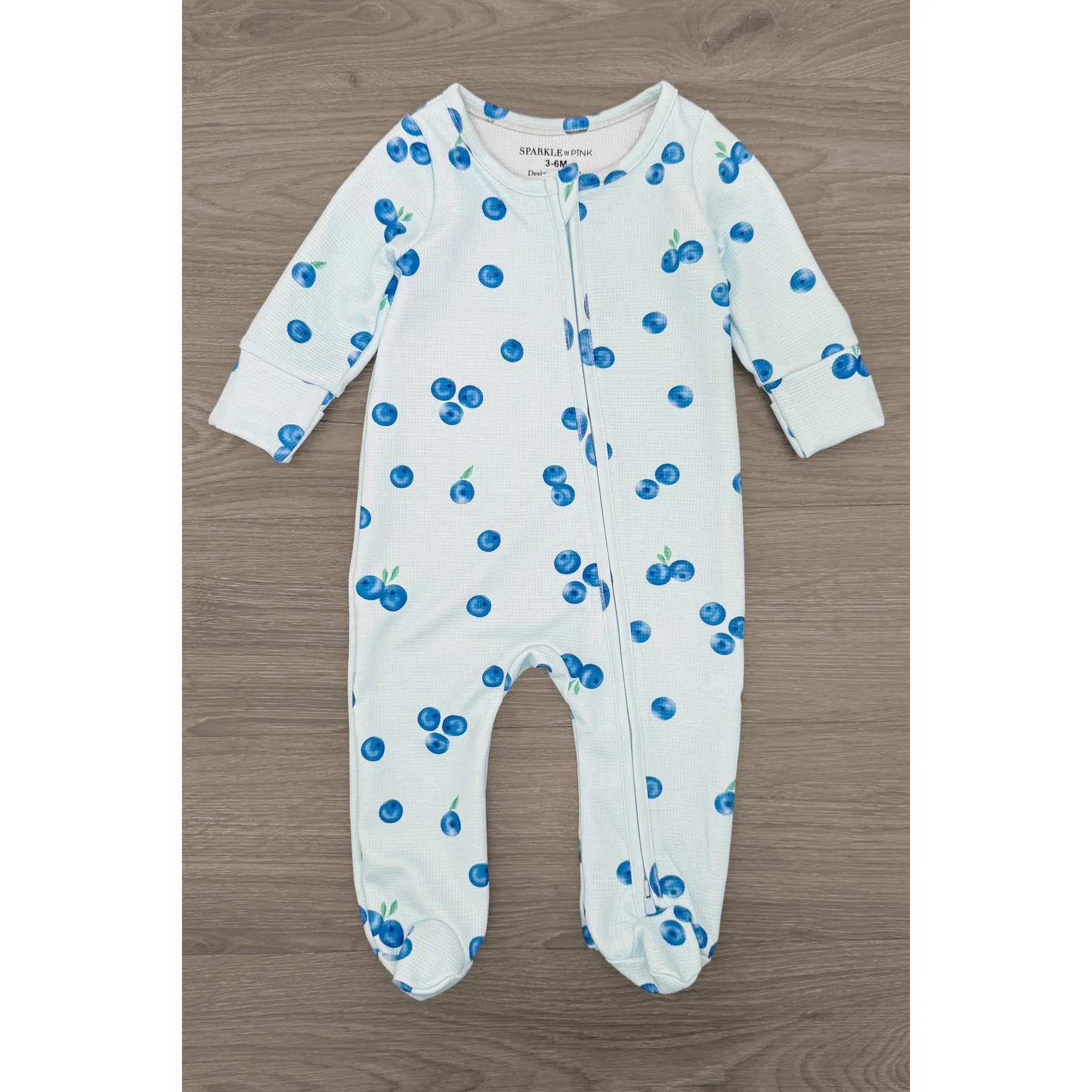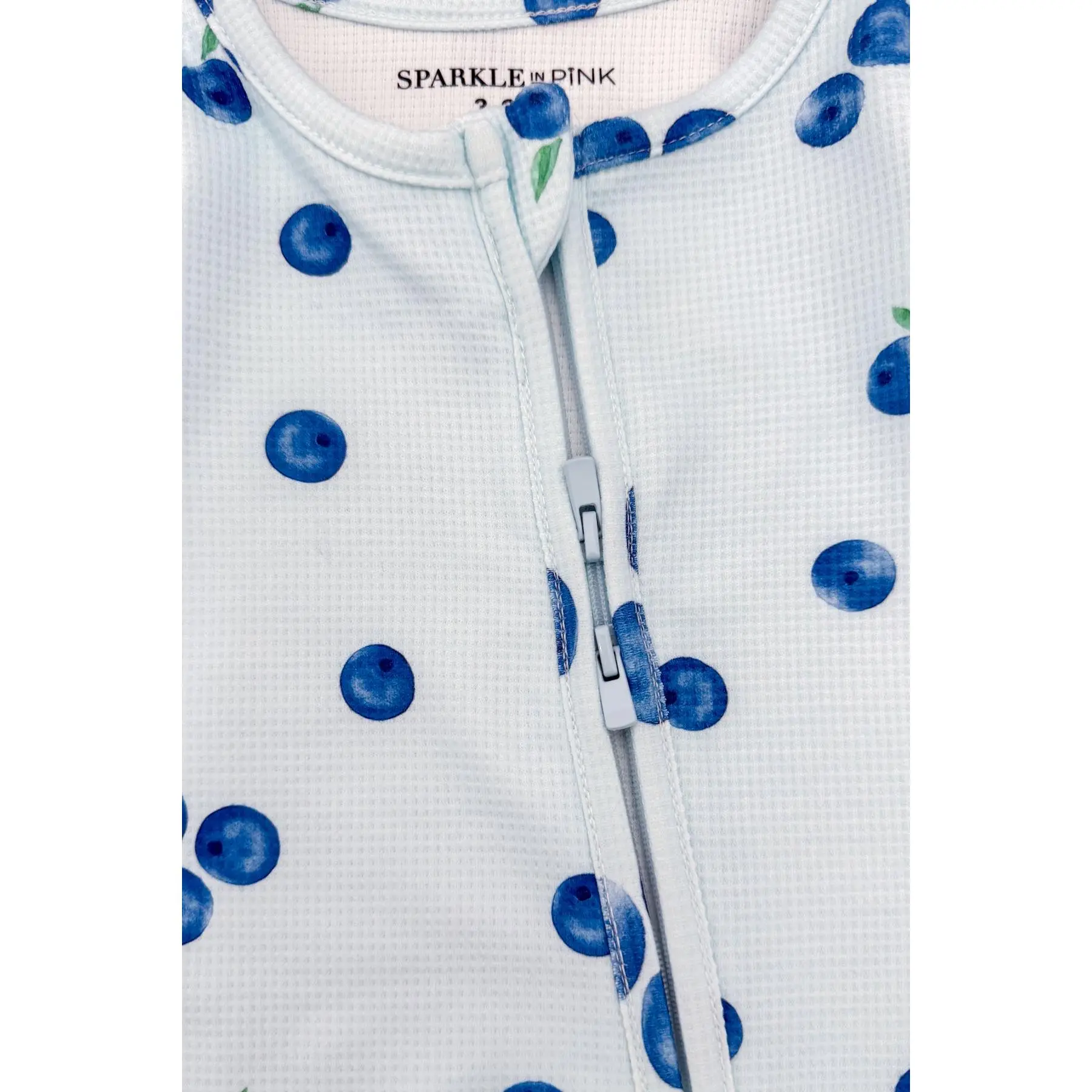 Cozy up with our Blueberry Waffle Knit Pajamas. The blue short sleeve top features an allover blueberry print and looks adorable paired with the matching shorts. The baby onesie features a front zip-up design with a matching print. The top and shorts can be worn as a set and paired with our matching bows or keep it laid back with a pair of slippers. This set is perfect for snuggling by the fireplace with your little ones!