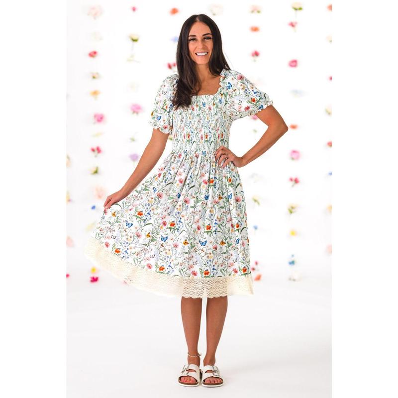 Twinning is winning in these Butterfly Floral Dresses! These dresses feature a feminine short sleeve with an allover floral butterfly design. This dress is made from soft and breathable fabric that will keep her comfy during all adventures. The flowy style design offers a feminine fit, while the floral print adds a sweet touch. She can pair it with some SIP bows & our sandals for the perfect look! Little ones love to match their mommy!