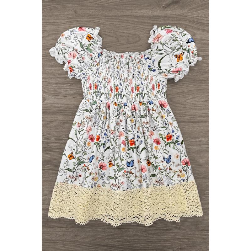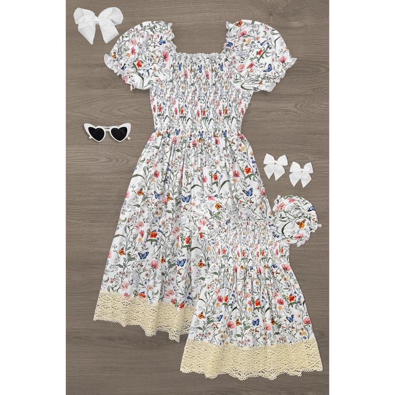 ·Mom & child dresses feature an allover floral butterfly design with crochet lace hem