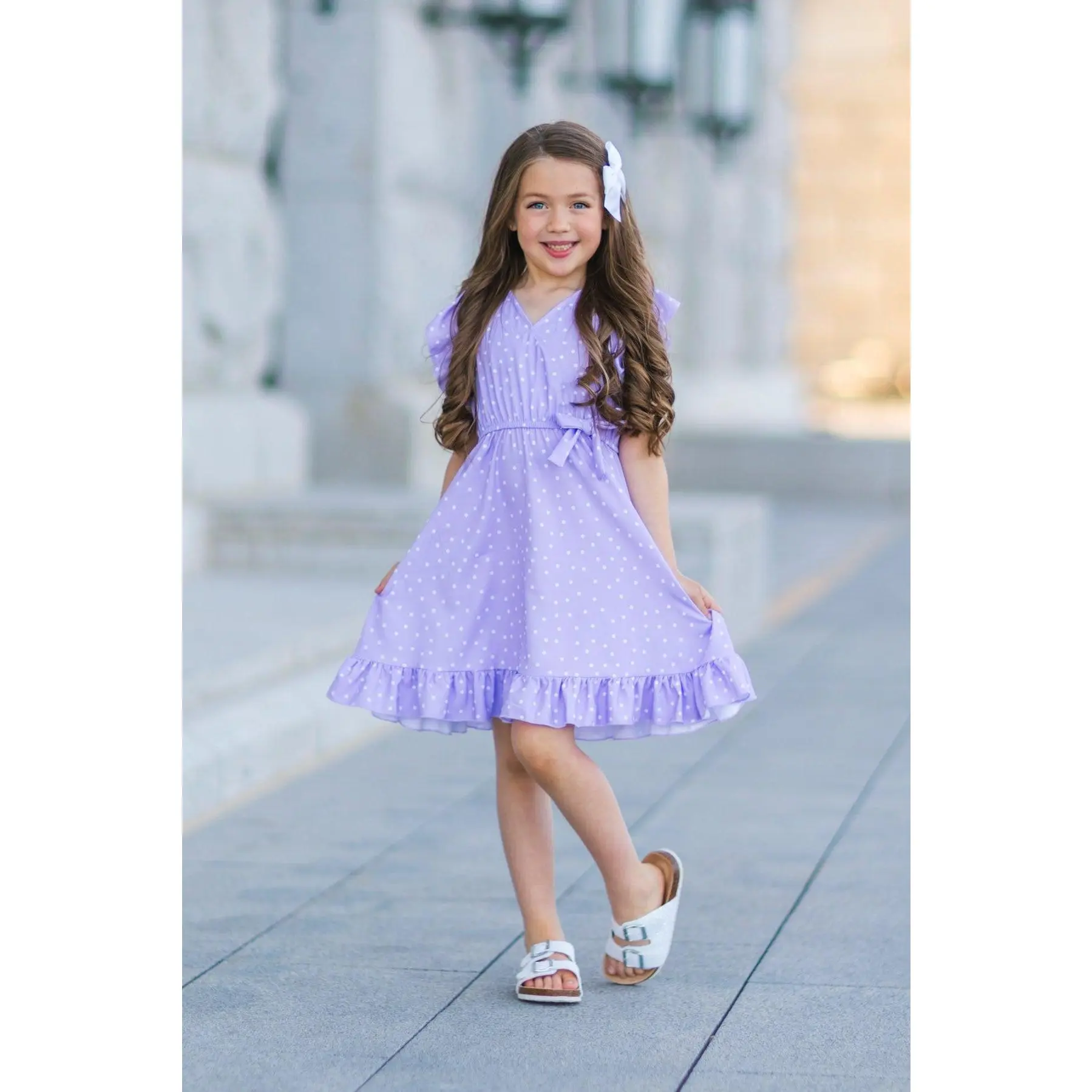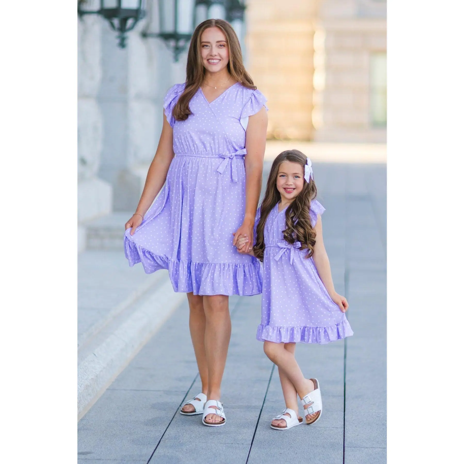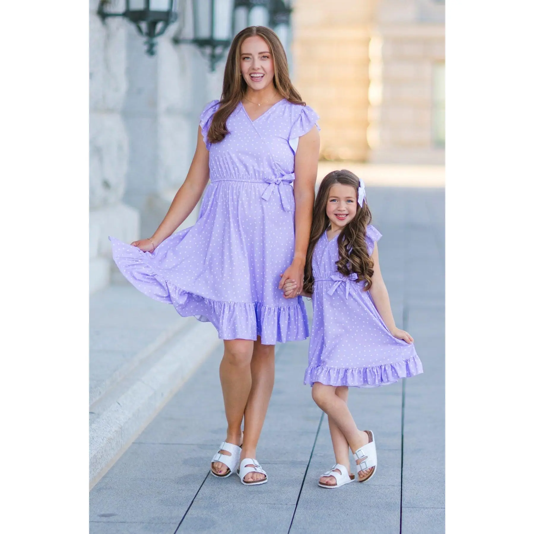 These Lavender Polka Dot Ruffle Dresses feature short ruffle sleeves and an allover lavender polka dot print. This dress is made from soft and breathable fabric that will keep her comfy during all adventures. The v-neck style & cinch waist offer a feminine fit, while the fluttery sleeves add a fun touch. She can pair it with some SIP bows & our sandals for the perfect look! Little ones love to match their mommy!