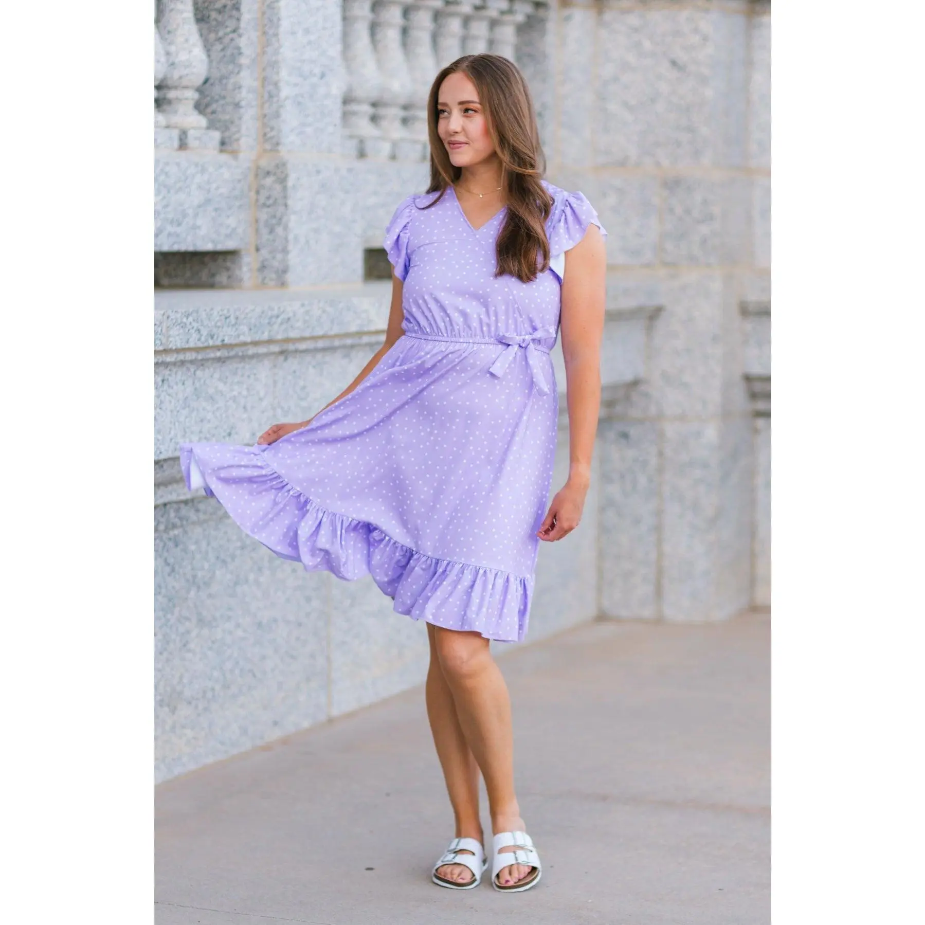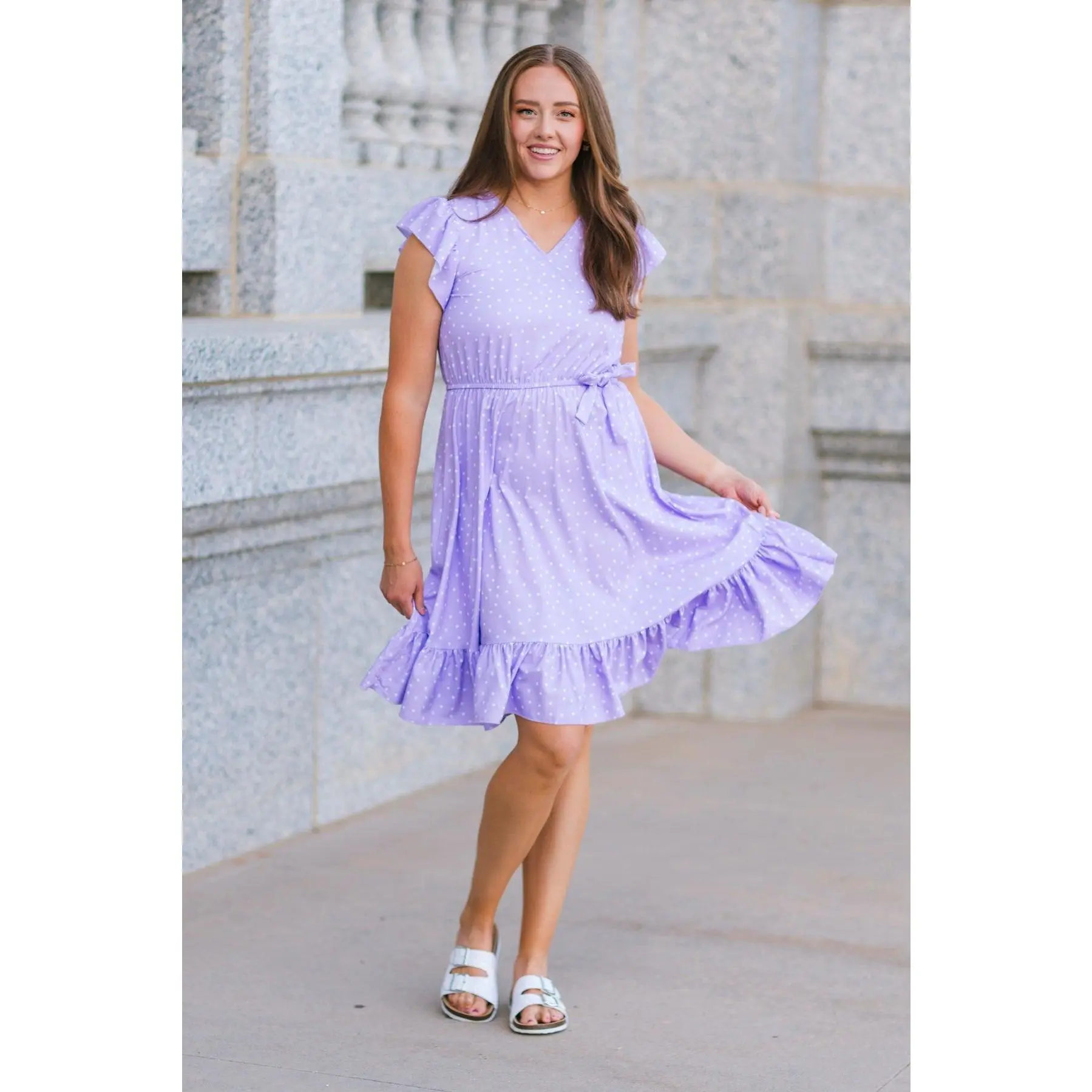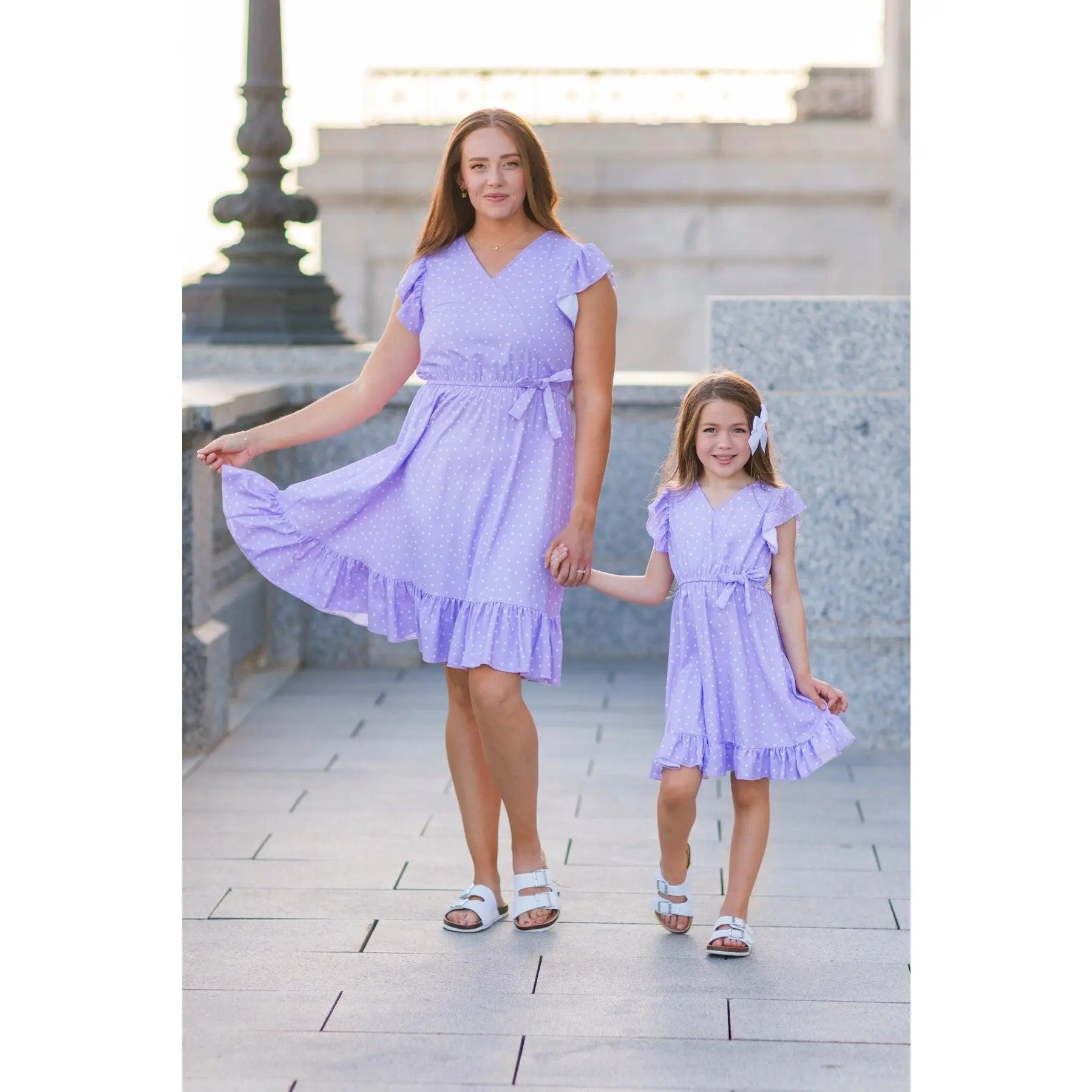 These Lavender Polka Dot Ruffle Dresses feature short ruffle sleeves and an allover lavender polka dot print. This dress is made from soft and breathable fabric that will keep her comfy during all adventures. The v-neck style & cinch waist offer a feminine fit, while the fluttery sleeves add a fun touch. She can pair it with some SIP bows & our sandals for the perfect look! Little ones love to match their mommy!