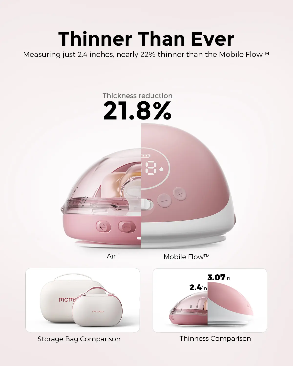 · Ultra-Slim & Discreet – At just 2.4 inches thick, it is 20% thinner than other conventional pumps on the market, making it the most compact wearable breast pump for ultimate privacy. · Transparent Top for Quick Alignment – The industry-first design simplifies nipple alignment and allows for easy milk volume monitoring. · Wireless Charging Convenience – The 1800mAh battery-powered charging case supports up to 15 pumping sessions or 5 days of use. · Smart App Connectivity – Syncs with the Momcozy app for automatic mode switching, real-time milk tracking, full-collector alerts, and more. · Comfort-Focused Design – Made from 50A soft silicone, providing a gentle and secure fit for all breast shapes. · Easy to Clean & Assemble – With only 5 parts to clean and no extra tools needed, the Air 1 is easy to assemble and maintain, saving you time while keeping it hygienic. The durable, non-porous PPSU milk collector is designed for easy cleaning, ensuring long-lasting performance.