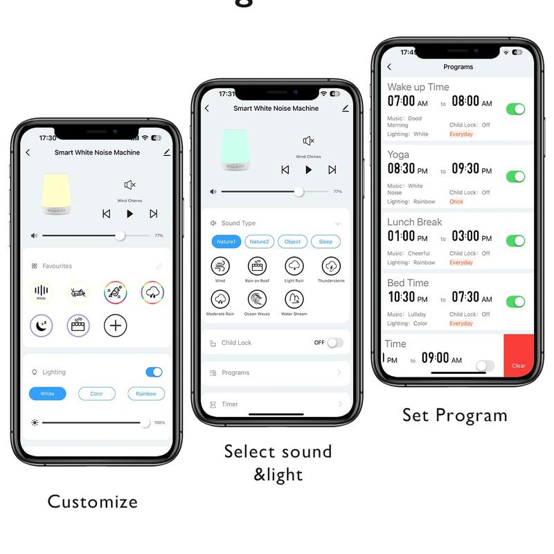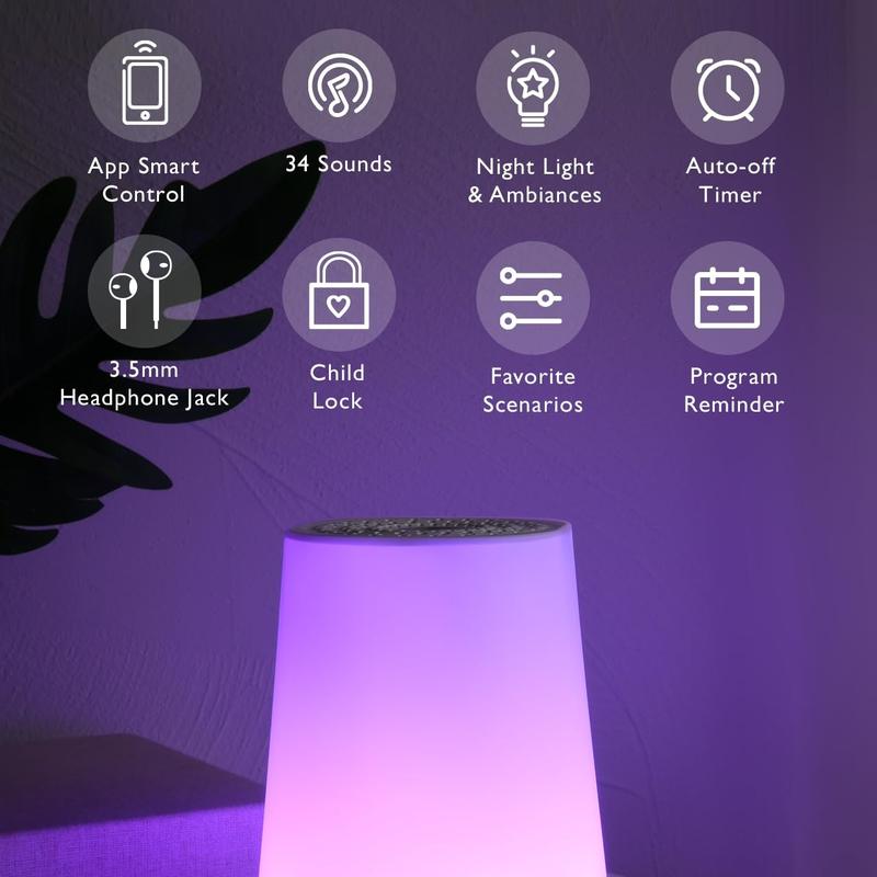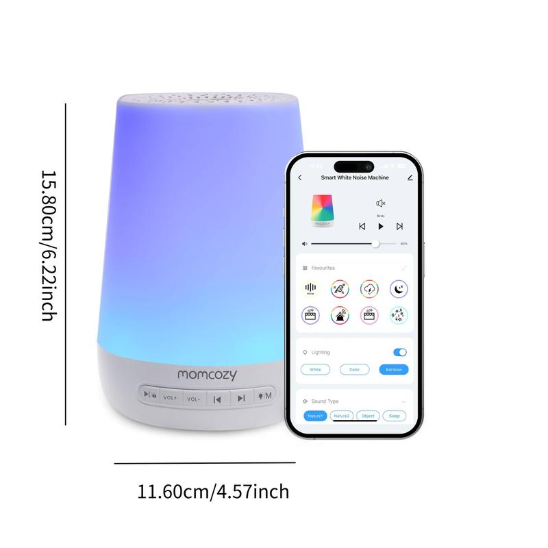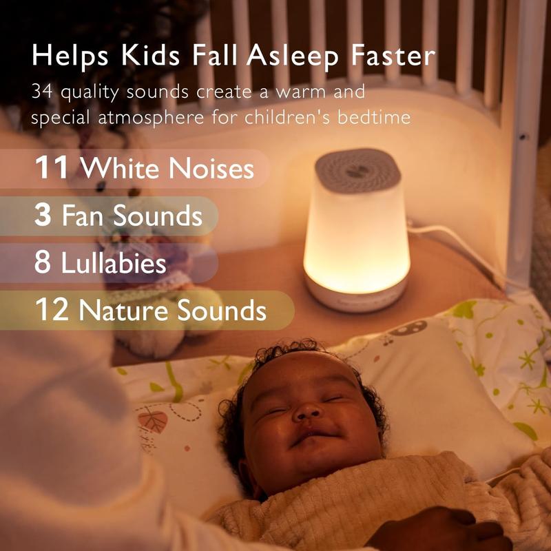 • 【Custom settings】The white noise machine can customize color, brightness, sound, and volume level. Set programs to turn off and on automatically based on your family’s sleep schedule.