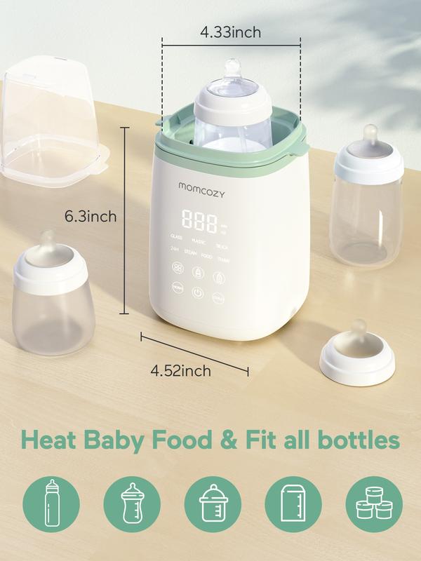 Momcozy Bottle Warmer: Fast Warming/Food Heating/Steaming/Thaw/24H Keep Warm/Material Selection. Momcozy smart bottle warmer fits most bottle types and materials and heats baby bottles, and baby food safely and evenly.