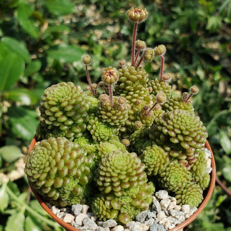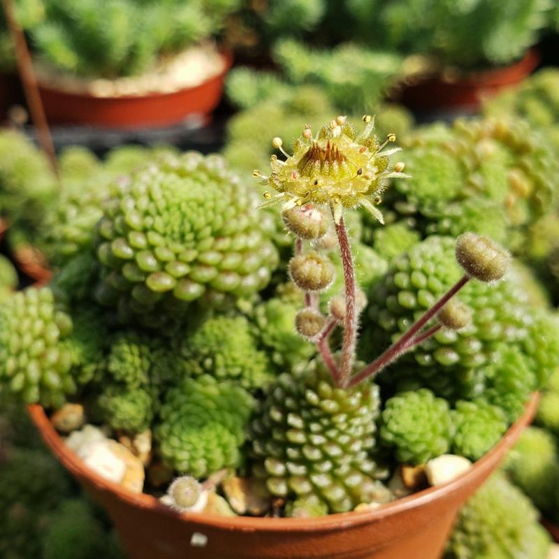 Monanthes polyphylla is a native of the Canary Islands. It belongs to the Crassulaceae family. This houseplant is low-growing with a slow growth rate. It reaches a height of 12 cm with dense clumps of rosettes formed by tiny soft and fleshy leaves. The green foliage grows upright and appears as a cone. Known by its common name Dwarf Crassula or One Flowered House Leek, the plant bears star-shaped flowers each during the summer season. The blooms are waxy and colored yellow, orange, or purple. This plant can survive challenging drought conditions but should be protected from direct sun. Due to its shrubby growth, it looks great in the flower beds in the garden. Growth Rate Monanthes polyphylla is a low and slow-growing succulent. Flowering During its blooming season in summers, the plant gives rise to multiple non-fragrant yellow, orange, and purple flowers. Watering and Feeding One of the basic demands of the plant is little water. Overwatering can kill the plant. As a result, it should be watered only when the soil is dry during summers. In winters, the frequency of watering should be reduced. Soil Another tip for Monanthes polyphylla care is that it needs well-draining soil that is poor in quality. Hardiness The hardiness zone of the plant is 11a to 11b. It prefers room temperature and is not frost-hardy. Light Months polyphylla does not like direct sun. Give it shaded light for the best growth. Propagation Propagation of the Dwarf Crassula is best done via seed or offsets. Monanthes means one flower in Greek, while Polyphylla means multiple leaves. Whether Monanthes polyphylla flowers or not, the foliage is impressive for everyone. Buy Monanthes polyphylla for sale online from Planet Desert.