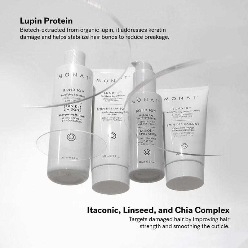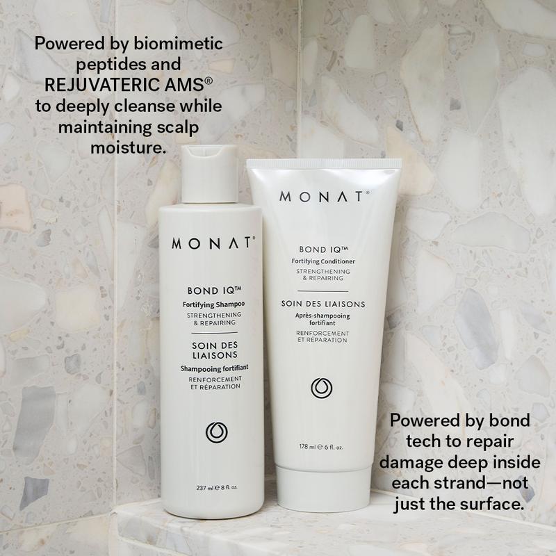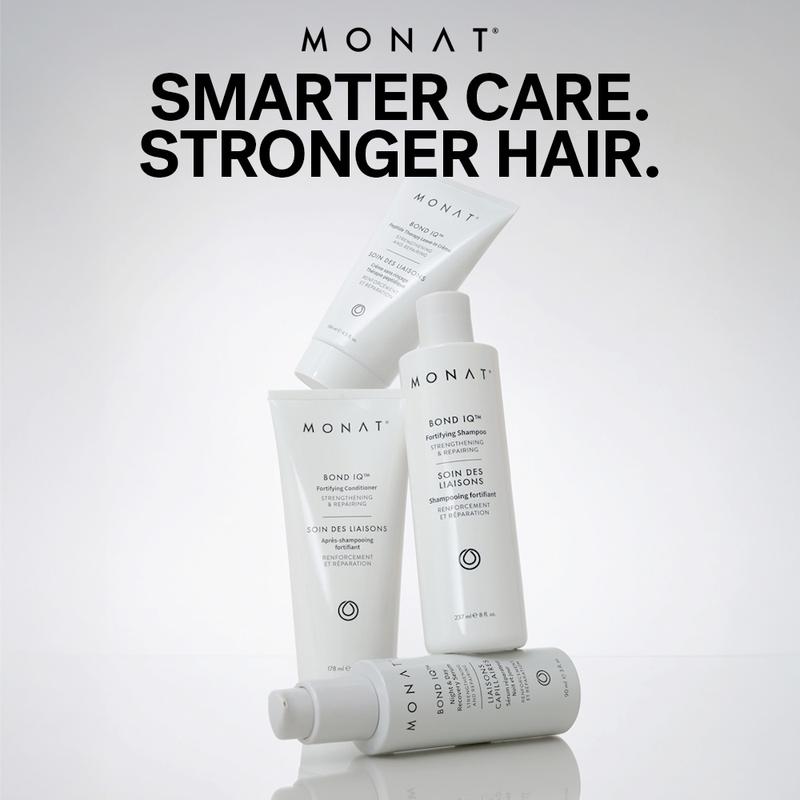 Smarter care. Stronger hair. MONAT BOND IQ offers total hair reconstruction from damage caused by chemical treatments, heat styling, environmental stressors, and combing and brushing. Through advanced biotechnology and nature’s powerful ingredients, including lupin protein, peptides, baobab extract, and our exclusive REJUVENIQE, the 4-step system targets the root cause of damage, strengthening hair from within.
