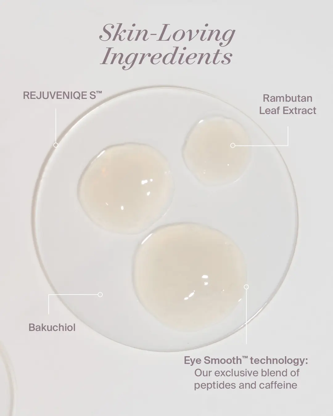 · Skin-loving ingredients including rambutan extract, bakuchiol, marine actives, caffeine, and peptides