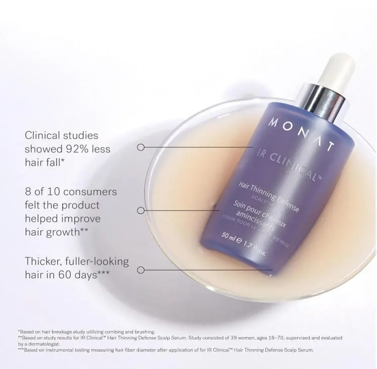 ***Based on an instrumental test by a third-party laboratory measuring the hair fiber diameter of healthy participants after application of IR Clinical(TM) Hair Thinning Defense Scalp Serum.