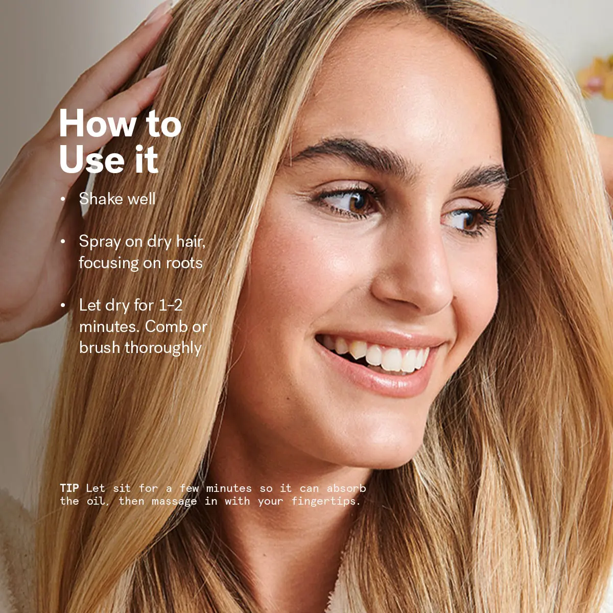 Shake well before use. Spray evenly 8–12 inches (20–25 cm) away from hair, focusing on the roots. Let dry for 1–2 minutes. Comb or brush thoroughly.