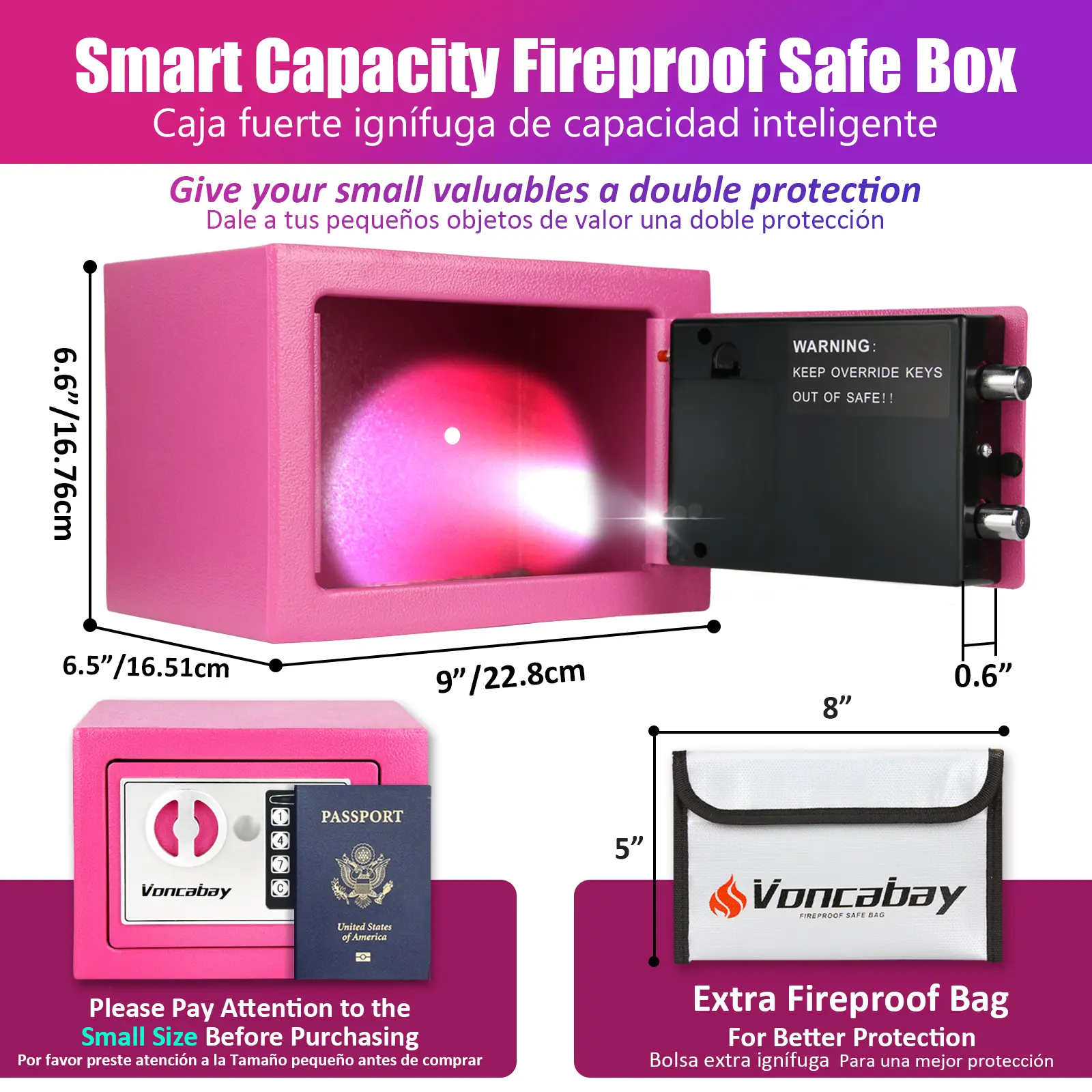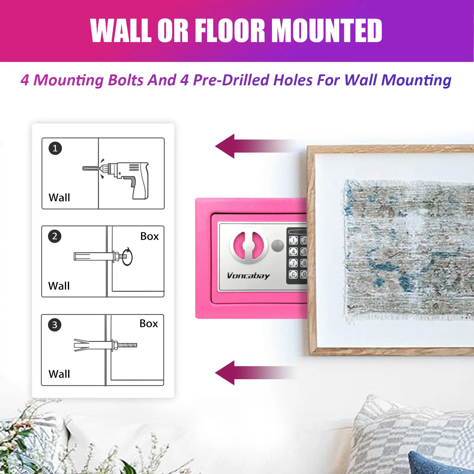 ·[Smart Capacity Safe Box with 4 Pre-Drilled Holes]: With only 0.23 Cubic Feet (Exterior: 9 x 6.6 x 6.5 inches), our Mini Hidden Safe Box can be used as a hotel safe, closet safe, wall safe, floor safe and fireproof cash box. With 4 Pre-drilled holes and 4 mounting bolts, you can fix pink safe box in wardrobes, drawers, bedside tables or hidden space. That means a thief cannot easily walk off with it. Please Pay Attention to the Size of the Mini Safe Box Before Purchasing.