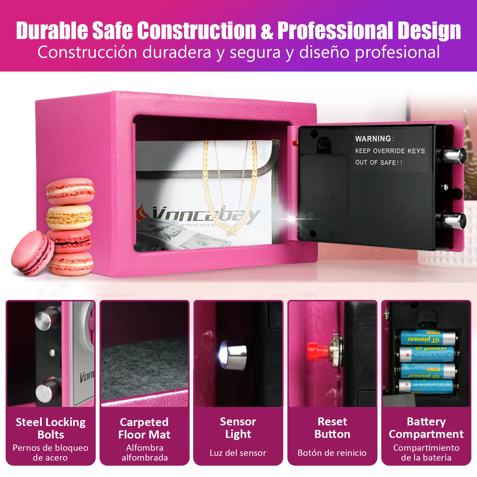 ·[Security Safe Box with Intelligent Sensor Light]: Voncabay Small Safe Box for Home automatically turns on the light after you open the safety box by Using Keypad, soft light makes it easy for you to get the items you need without hurting your eyes and it will turn off after 30 seconds. Additionally, our numeric keypad of Security Safe Box will remind you whether the password is correct with an indicator light and remind you battery is about to run out by lighting up a red light.