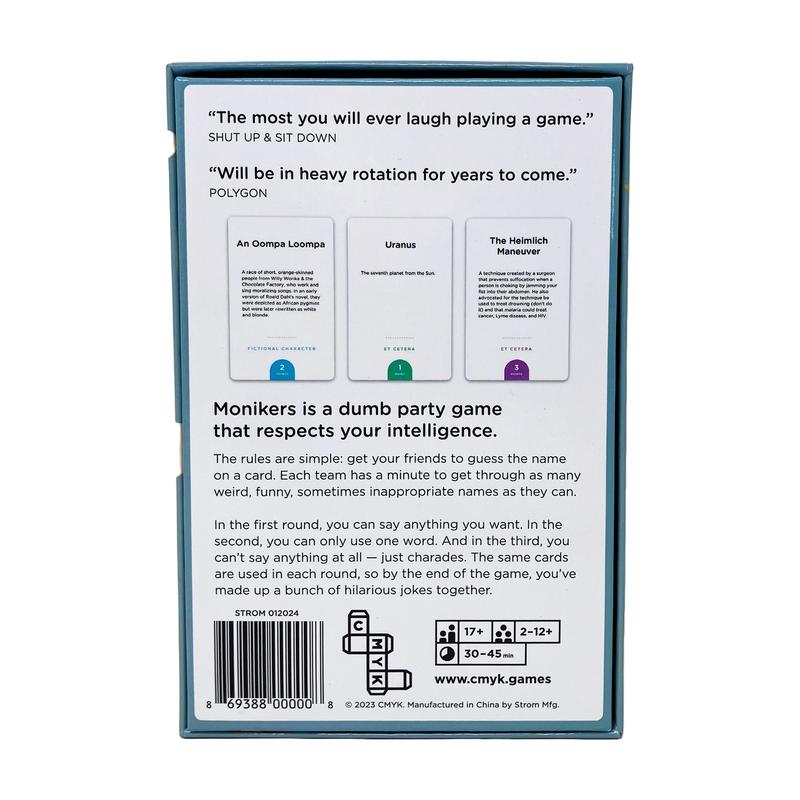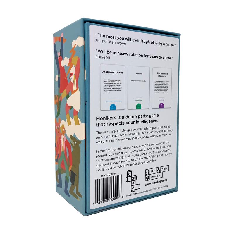 Monikers is a dumb party game that respects your intelligence. At the start of the game, you will receive a set of cards featuring names of famous and historical people. The object is simple: get your team to guess as many names as possible. Each team has a minute to get through as many weird, funny, sometimes inappropriate names as they can. But over 3 rounds, you'll have to follow different rules about how to give your clues.